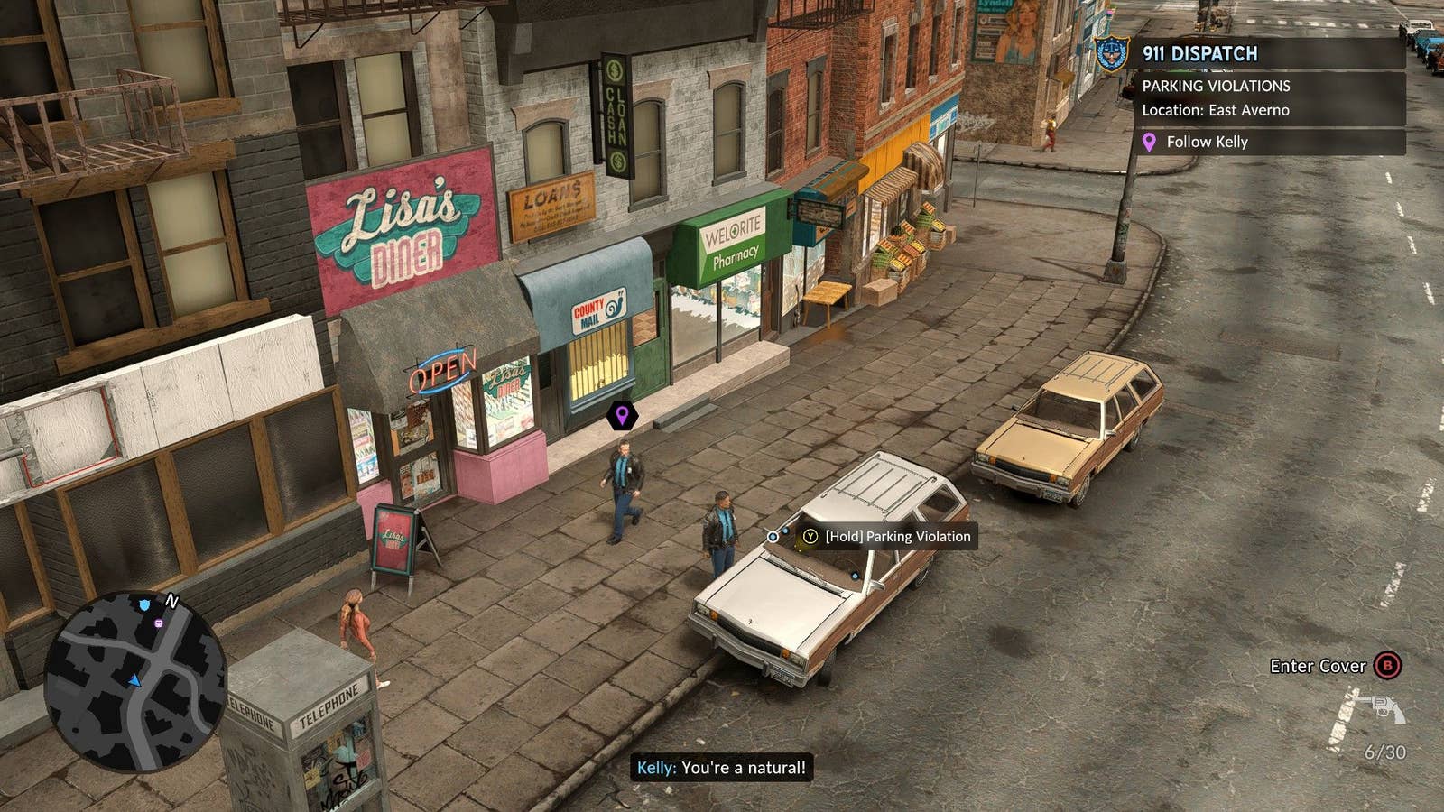 Оживленный мегаполис Аверно полон нарушителей закона, как и печально известный город Готем, создавая комически преступную атмосферу. Каждые несколько шагов приводят к встрече с каким-нибудь правонарушением, что ведет к бесконечному потоку забавных инцидентов. Например, преследуя подозреваемого в убийстве, я столкнулся с прохожим, который грабил кого-то на ножевых угрозах. Увидев приближающегося офицера, он запаниковал и напал на меня своим ломиком. В другой раз я преследовал преступника до станции метро и повалил его на рельсы, только чтобы нас обоих сбил следующий поезд.