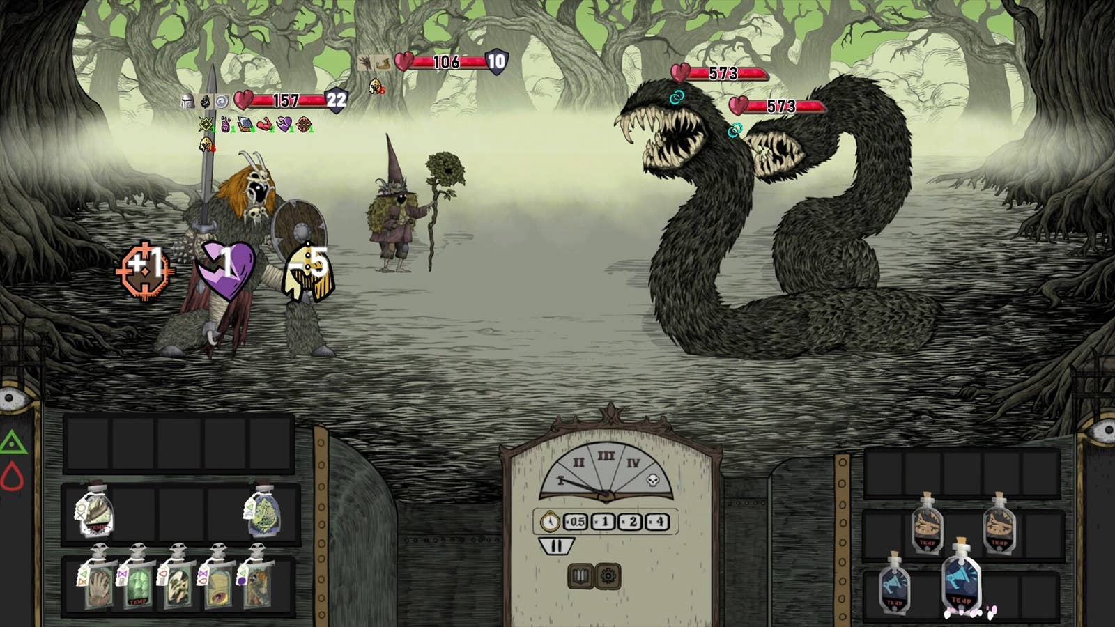 Вы берете на себя роль алхимика, погрязшего в долгах, командующего гомункулами в бою, чтобы собирать драгоценную кровь побежденных монстров. Каждый гомункул (это прекрасное слово!) может быть оснащен пятью колбами, дающими ему силу, которые он будет использовать в определенные моменты во время боя. Каждая колба соответствует определенной стихии. Комбинирование стихий последовательно создает более сильные эффекты, поэтому вам нужно будет тщательно обдумать, стоит ли отдавать приоритет немедленным преимуществам каждой колбы или сосредоточиться на создании элементарных комбинаций.