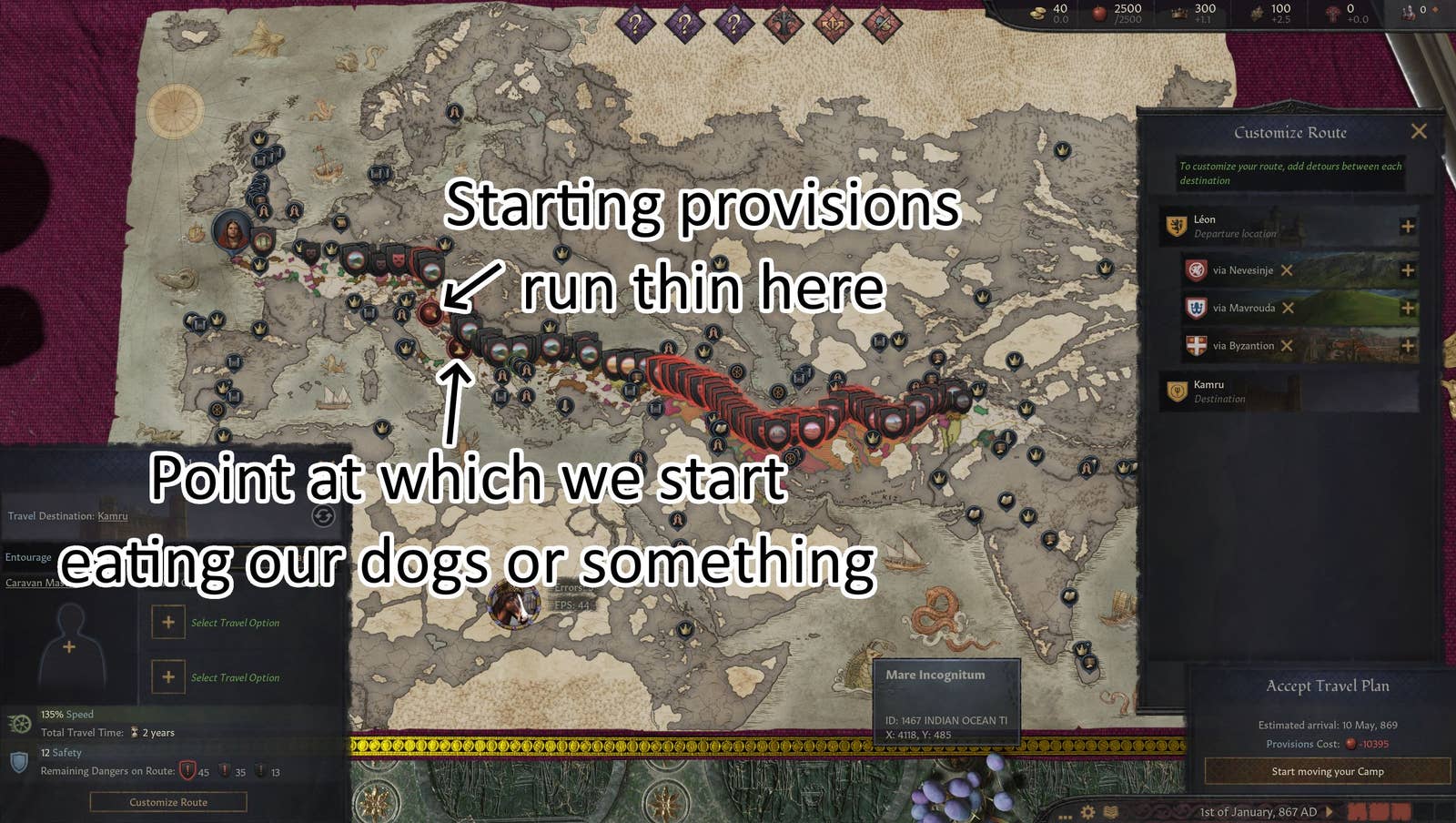 Действительно, это именно тот захватывающий опыт, которого я жажду, играя в Crusader Kings III. Он предлагает путешествия, острые ощущения и даже неожиданные несчастья, например, случайное высыпание всех ваших припасов в лужу навоза на обочине дороги.