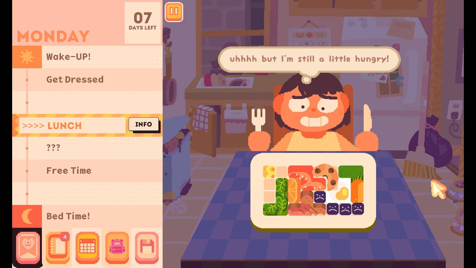 Consume Me визуально изобретательна и удивительным образом фокусируется на управлении ресурсами, что также служит комментарием о том, как мы превращаем заботу о себе в игру. Игровой процесс построен вокруг дней, наполненных как запланированными, так и неожиданными событиями – такими как походы по магазинам, встречи с привлекательными людьми и, самое главное, еда. Во время приемов пищи вам нужно накормить Дженни достаточно, чтобы заполнить ее шкалу ‘Желудка’, но не позволяя ей делать слишком много ‘Укусов’. В моей игре я сначала просто складывал предметы на ее тарелку, используя физический движок игры, но потом Дженни начала читать журнал о диетах, и задача поесть превратилась в головоломку, где нужно соединять блоки, похожие на Tetris.