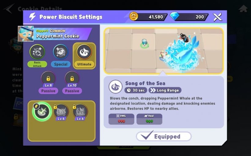 Mint leaves for Peppermint Cookie were gathered from a town near the clear sea. This Cookie likes to spend time at the shore, staring dreamily at the horizon. When playing the shell ocarina, the Peppermint Whale comes to say hello from the depths.