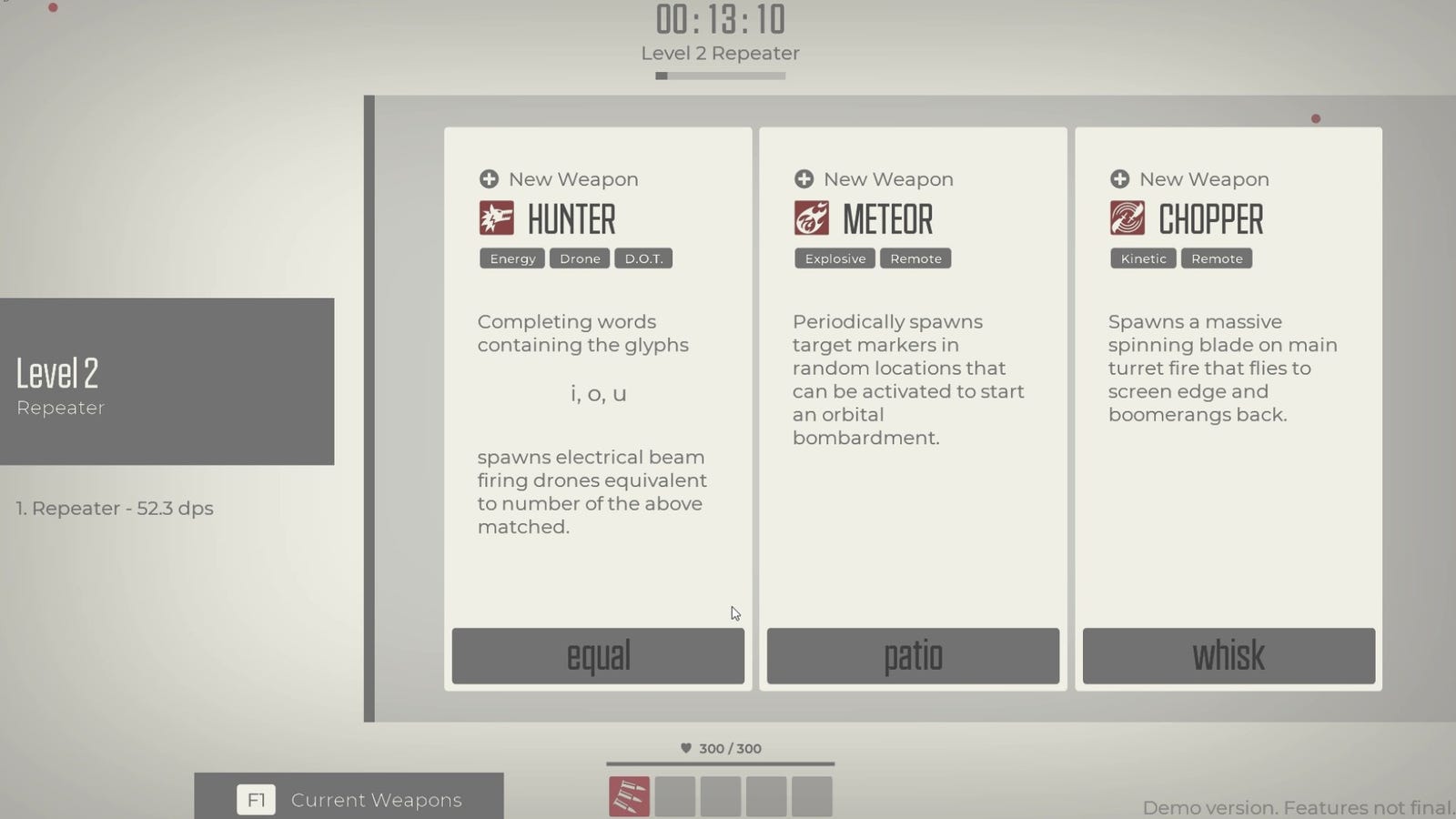 Быстро вводите точные слова, чтобы продвигаться вперед, открывая умные улучшения. Эти щиты защищают от злонамеренного словесного салата. Одно обновление вызывает полезных дронов, атакующих целевые слова при заполнении слов, содержащих i, o и u. Другой высвобождает электрические поля, которые мешают и ослабляют слова в пределах их досягаемости, действуя на определенные комбинации букв. Стратегическое завершение слов может помочь справиться с интенсивными группами слов, например, сосредоточив внимание на слове с буквой «i», чтобы предотвратить более крупную угрозу.