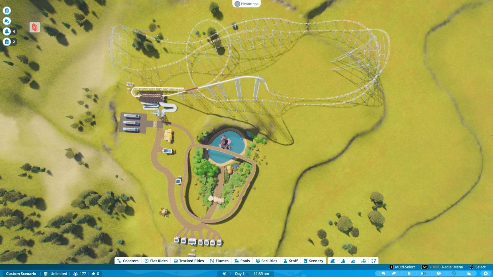 В сиквеле присутствует много знакомых элементов, но особое внимание уделяется созданию собственных аттракционов, аттракционов, продовольственных киосков и объектов с нуля, а не полагаться исключительно на готовые варианты. Этот опыт строительства распространяется даже на настройку существующих структур, таких как раздевалки и закусочные, что позволяет легко интегрировать их в другие здания, подобно соединению модульных игрушечных моделей. В ходе прохождения я построил некоторые фундаментальные удобства, такие как ряд киосков с едой и напитками, а также два сувенирных магазина, размещенные в одной модульной конструкции. Однако выдающиеся творения игроков из предыдущей игры, в том числе аттракцион на тему Чужих и сбивающее с толку количество «подставок для эвтаназии», предполагают, что вы сможете значительно превзойти мои усилия.