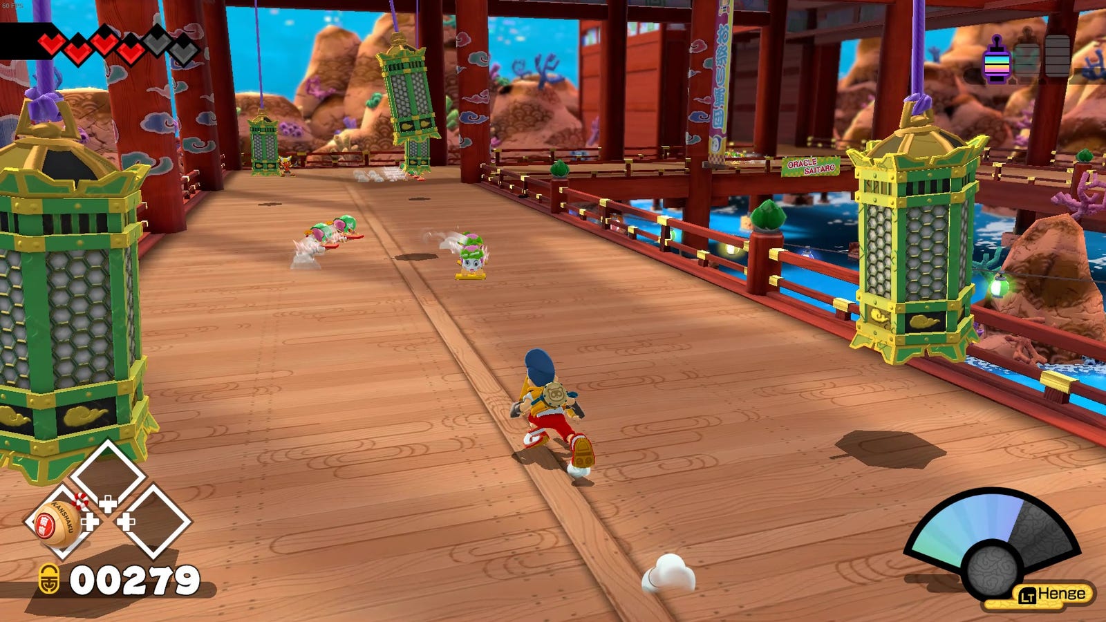 Аити находится в стадии строительства, где враги поворачиваются и раскачиваются, держа тяжелые балки, угрожая сбить вас с ног. Канагава — это осеннее восхождение на гору, во время которого вы прыгаете по бревнам и уклоняетесь от валунов. Сидзуока — это лес, полный необычных сосен, и береговая линия, заполненная начинающими мастерами кендо. Отправляйтесь на Окинаву, и вы сядете в собаку-робота, которая превратится в лодку для гонок по прибою (это может быть аутентично, а может и нет). В лучшем случае, путешествие Бакеру по каждой префектуре похоже на листание карикатурного туристического буклета.