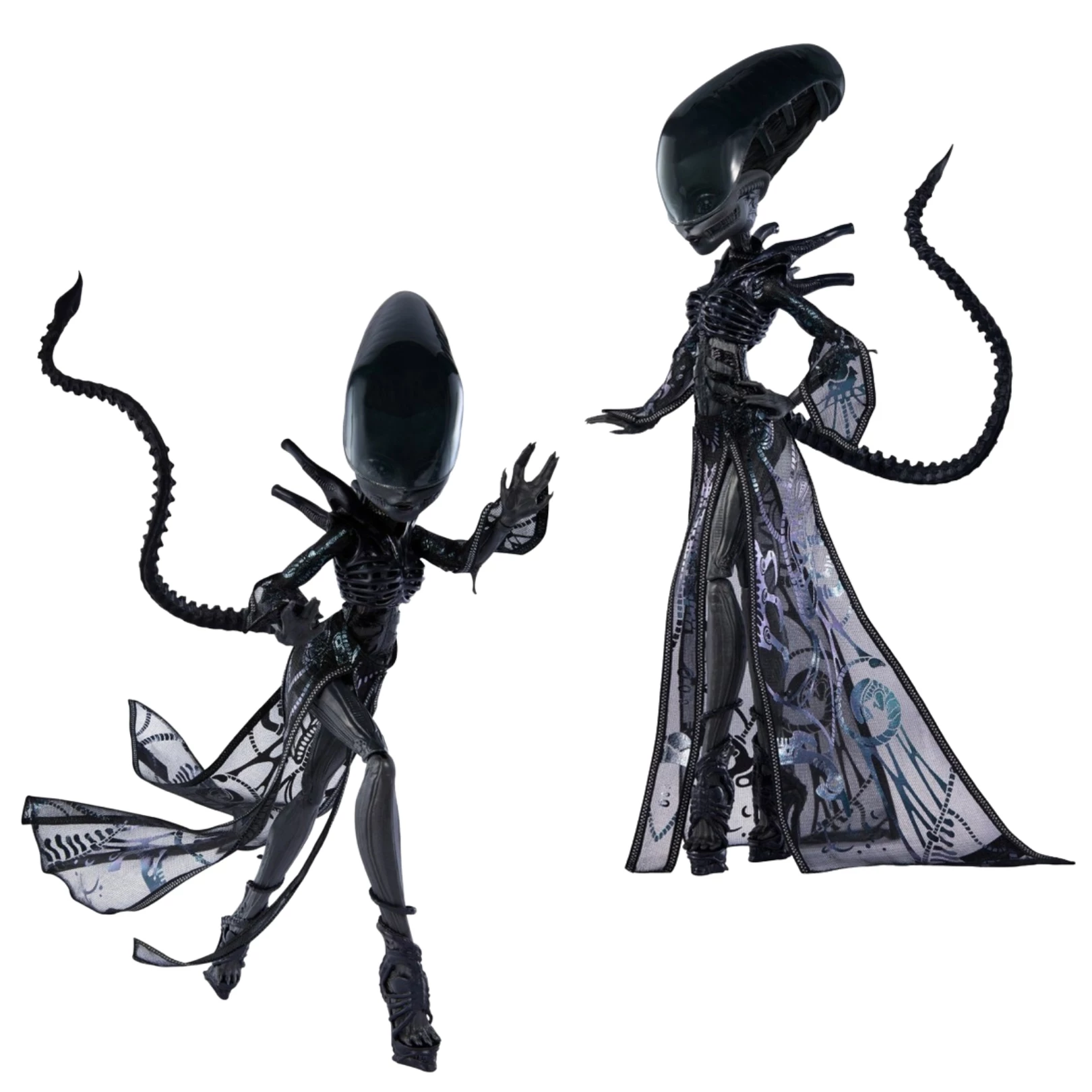 Эта кукла – стильное посвящение знаменитому ксеноморфу из научной фантастики. Она отличается облегающим черным платьем с деталями, вдохновленными экзоскелетом существа, и головным убором, имитирующим форму его черепа. Mattel описывает ее как уникальный и детализированный коллекционный предмет, идеальный для поклонников научной фантастики и поп-культуры. Она поставляется в специальной коллекционной упаковке с сертификатом подлинности, предлагая модную интерпретацию иконы ужасов.