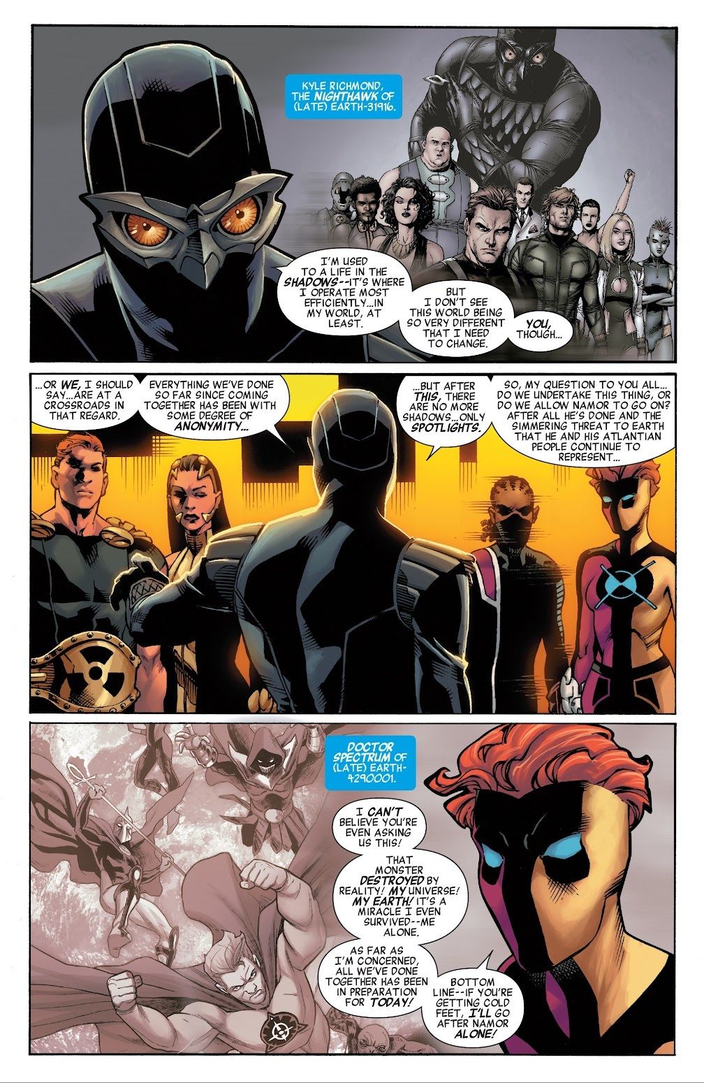 Действия Капитана Америки привели к его изгнанию, но Иллюминаты не были уверены, как действовать дальше. Намор, однако, отделился от группы и сформировал свой собственный альянс. Пока Иллюминаты спорили, Намор объединился с группой злодеев, известных как Кабал – включая Таноса и других – и начал атаковать альтернативные реальности, надеясь устранить потенциальные угрозы для их собственной Земли.