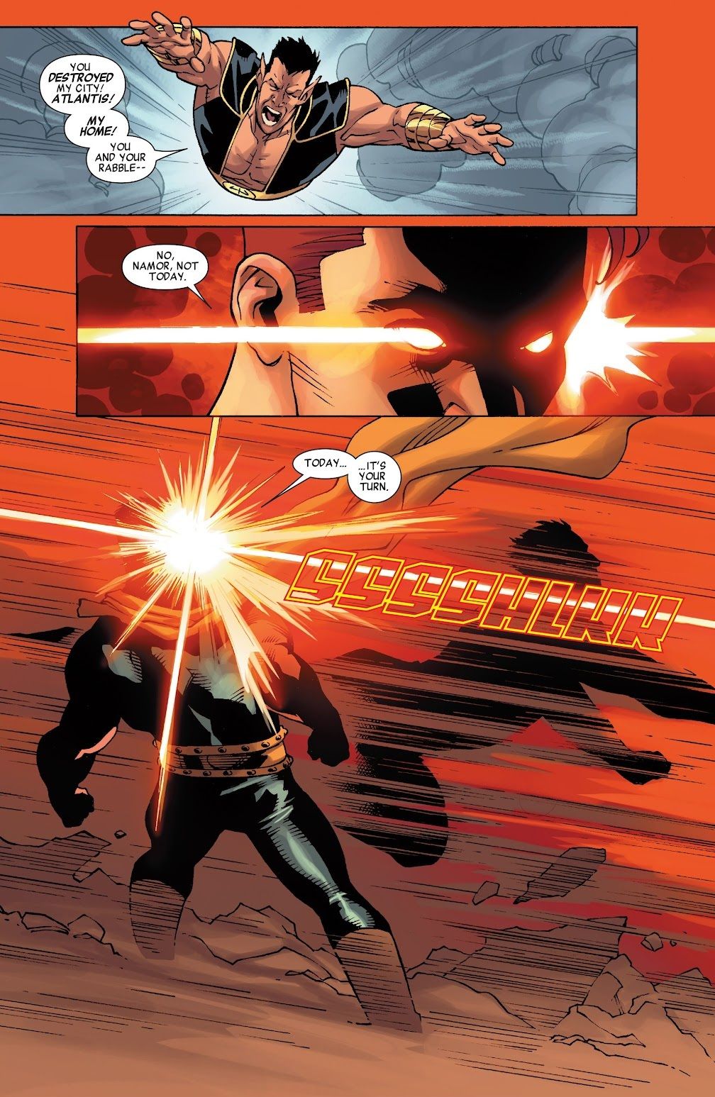 Окей, так вот тогда всё стало напряжённым. Намор, будучи бесстрашным парнем, вызвал Гипериона на поединок один на один. Но, честно говоря, всё закончилось, прежде чем по-настоящему началось! Гиперион, который, по сути, как Супермен со всеми этими способностями, даже не стал вступать в настоящую схватку. Он просто… использовал своё тепловое зрение и отрубил голову Намору, когда тот надвигался на него. Это было шокирующе, мягко говоря!