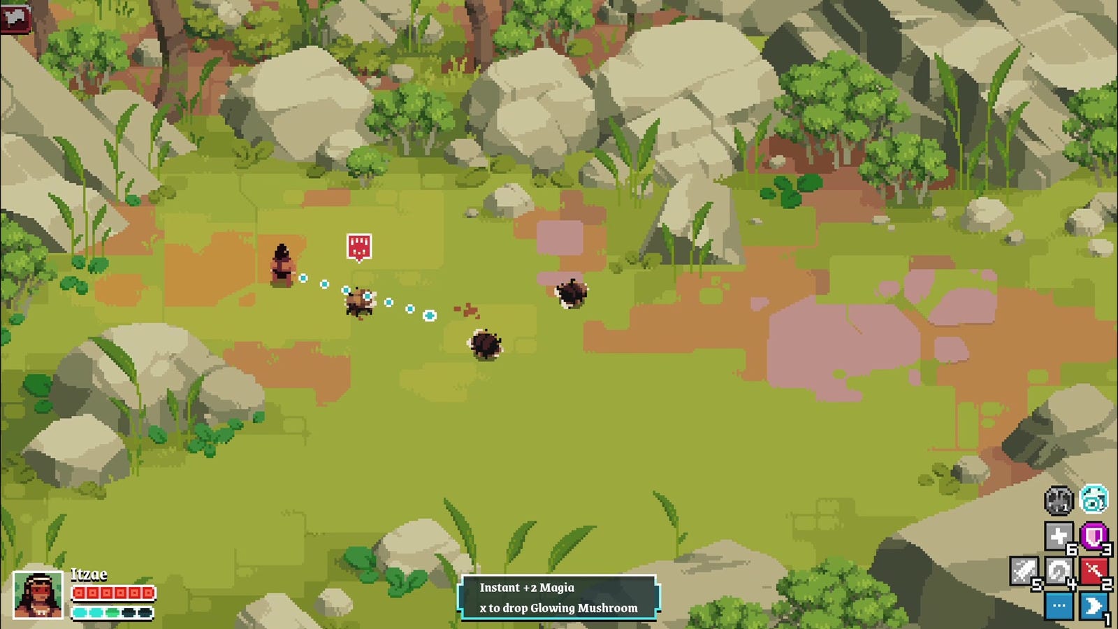 Я доволен структурой квестов Арко, за исключением линейности. Он следует схеме перехода в локацию A для борьбы с врагом B с дополнительным побочным путешествием в пещеру C за спрятанными сокровищами D. Это похоже на другие ролевые игры с пиксельной графикой с планировкой внешнего мира/подземелья/боевой арены. Несмотря на такую предсказуемую структуру, я нахожу мир игры увлекательным, наполненным огромными лесными слизняками и элементами западного стиля.