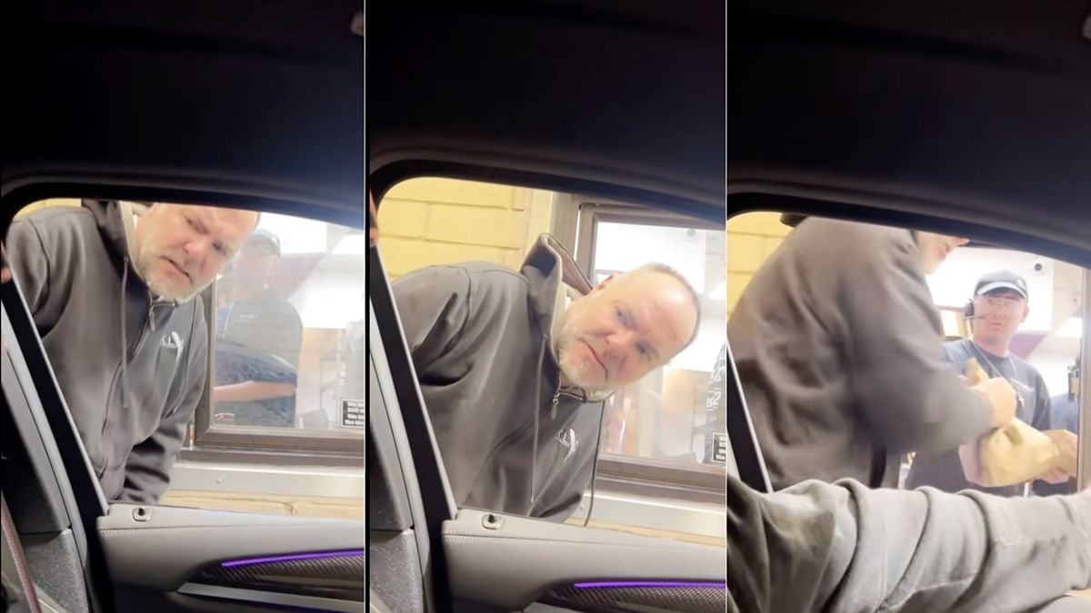 Мужчина подошел к их машине и сердито спросил, почему они так долго ждали. Кто-то в машине начал записывать разговор, который позже был опубликован в интернете. Спор продолжался некоторое время до начала записи. Нетерпеливый мужчина саркастически помахал камерой и сказал: ‘Так мы все можем просто уйти?’ и поприветствовал её пренебрежительно: ‘Привет’. Женщина в машине немедленно ответила оскорблением, на что мужчина показал ей неприличный жест. Водитель объяснил, что они ждут своей очереди, как и он. Мужчина, явно расстроенный, возразил: ‘Должен ли я? Вы ждете уже двадцать минут!’ На вопрос, является ли он тем, кто готовит еду, он сказал, что ему всё равно.