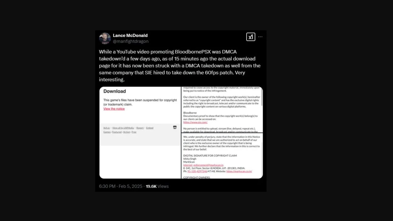 Найти недооцененные активыПосле недавнего удаления DMCA видео -рекламы на YouTube Adquireding Bloodborne, как подробно описано известным моддером Лэнсом Макдональдом, стоит отметить, что Markscan также стоял за еще одним недавним ударом — на этот раз нацеливался Проблемы с 2021 года.