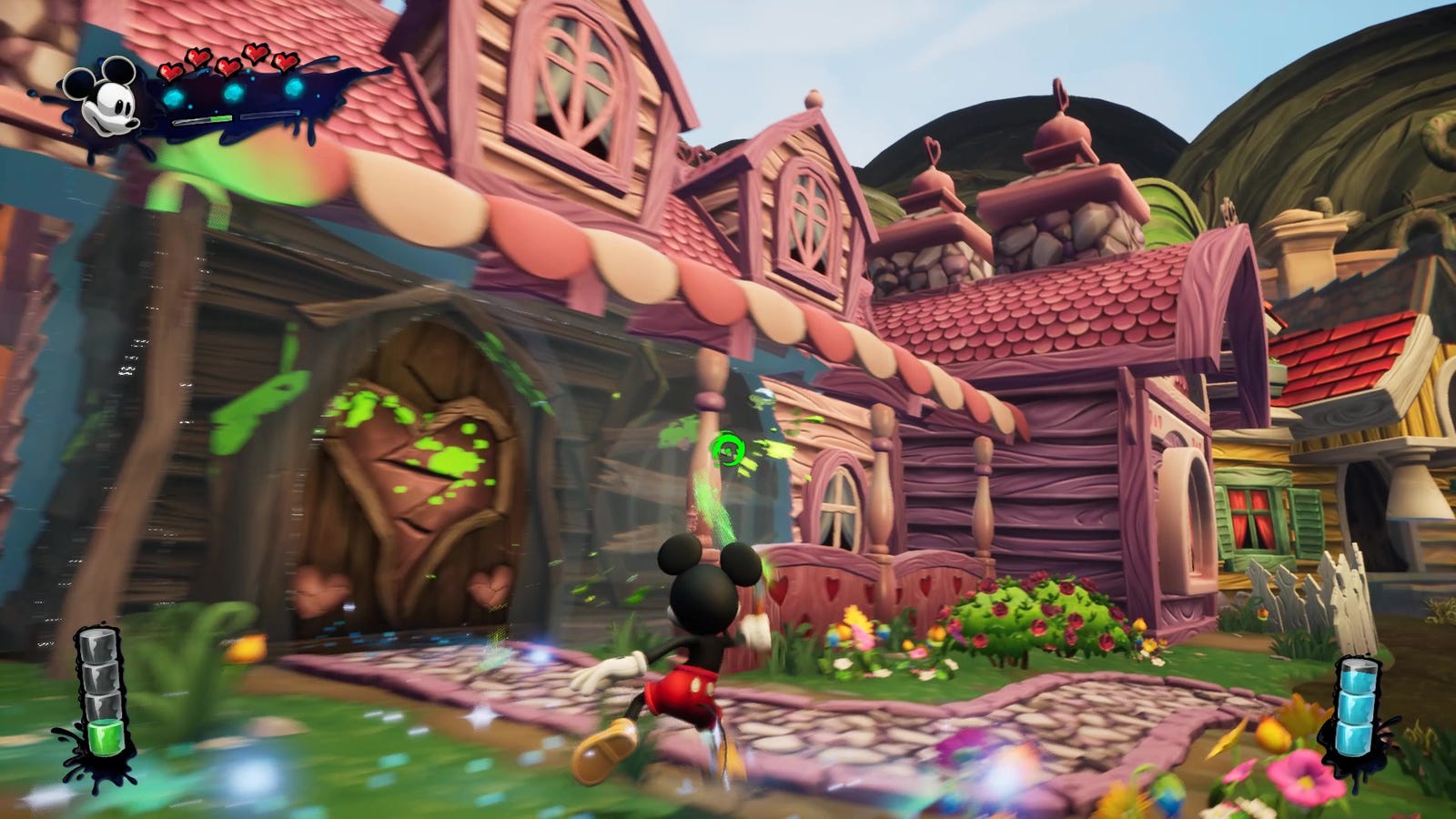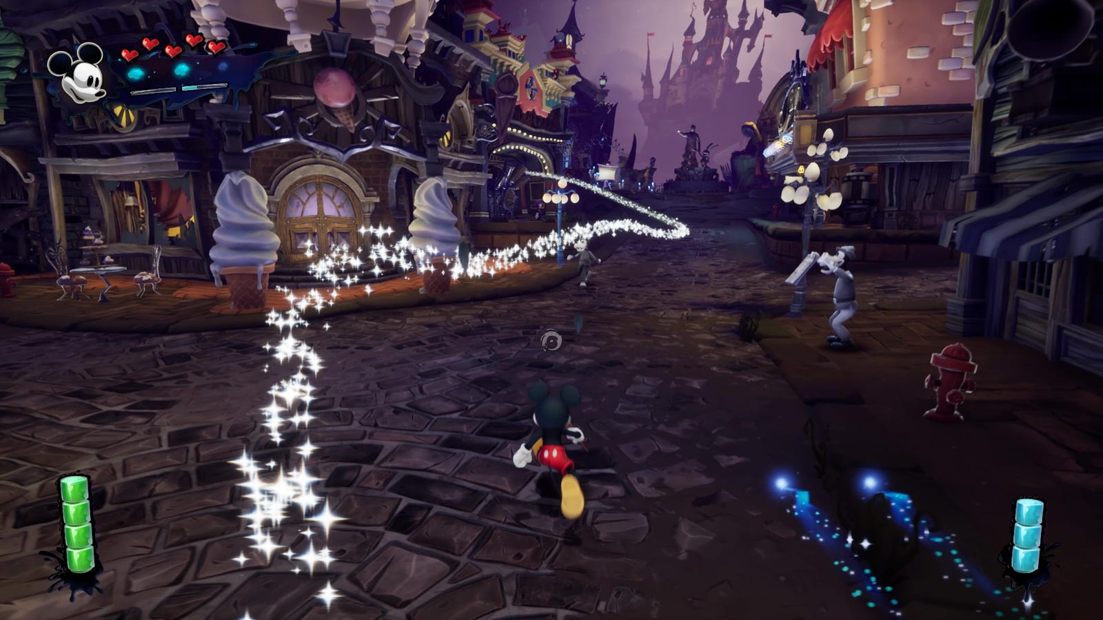 Итак, у Микки теперь есть зачарованная кисть, которую он изначально несправедливо получил, и которой поручено исправлять хаос, который он вызвал в мире. Признаюсь, в детстве я не был большим поклонником Диснея (я предпочитал матчи «Лаборатория Декстера» и «Ад в клетке» «Королю Льву»), но должен сказать, что обстановка в игре интригует. Учитывая, что это царство, населенное забытыми персонажами Диснея и изгоями, оно дает интересный взгляд на их прошлое и движущую силу: вы искренне хотите помочь этим несчастным существам.