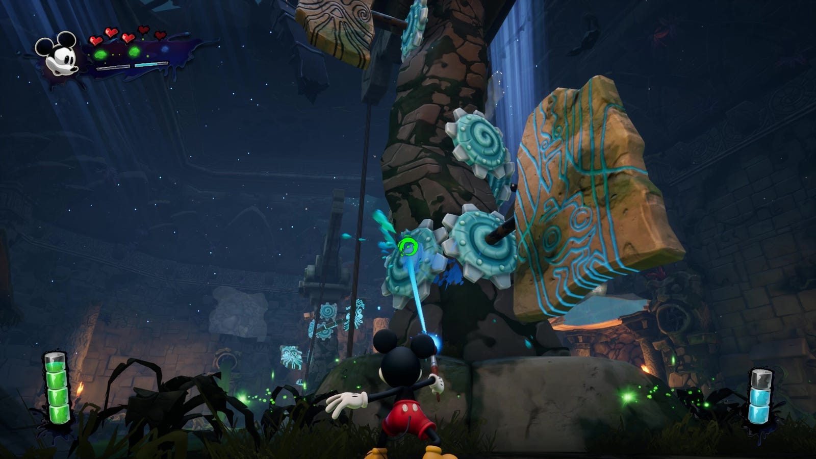 Путешествуя по разным локациям, Микки встретит ветхие канализационные системы, разрушающиеся тематические парки с неустойчивыми ракетами, разрушающиеся руины, города, опустошенные пожаром, и острова, захваченные пиратами. Скорость, с которой вы пересекаете эти области, высока, поскольку каждая локация разделена на выполнимые задачи, похожие на головоломки. Большинство заданий предполагает вычеркивание пунктов из списка: сбор масок, поиск выключателей, спасение друзей. Значительная часть вашего времени будет потрачена на исследование пространства и поиск выделенных объектов, которые часто четко выделяются. Возможно, вам придется активировать переключатель на объекте, чтобы создать платформы, чтобы добраться до него. Иногда сундук может загореться, поэтому уберите платформу над ним, где хранятся бочки с водой. Самое приятное то, что вы регулируете или снимаете шестерни, позволяя им вращаться или удерживать платформы устойчиво для вас.