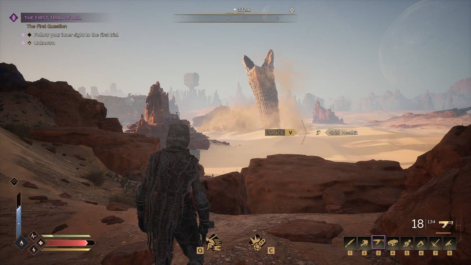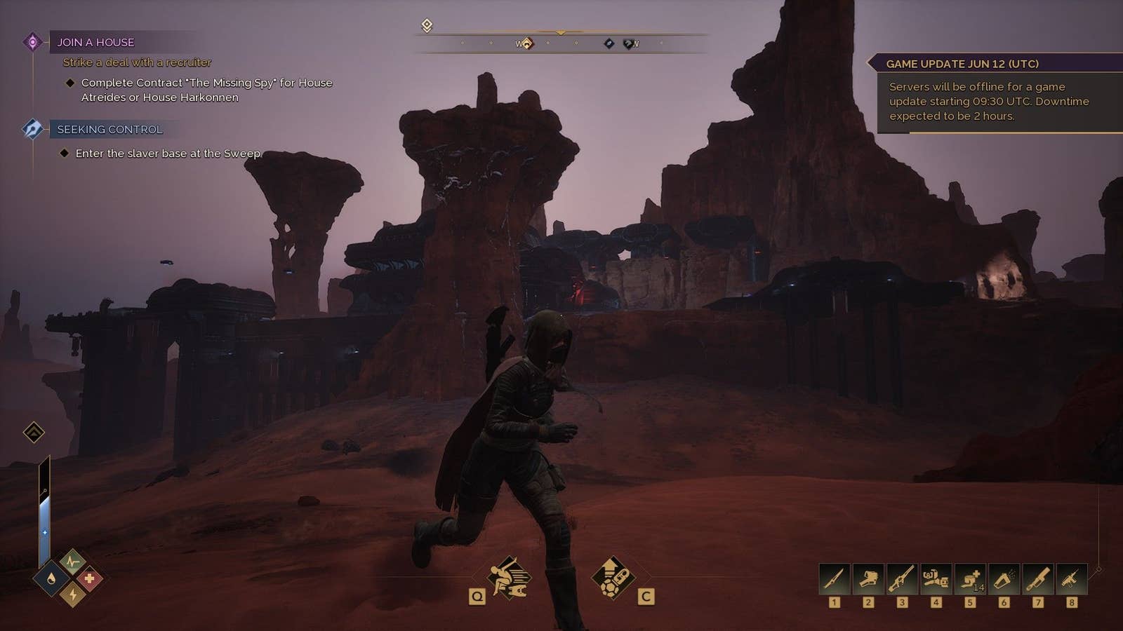 Системы выживания на Арракисе делают мечту каждого ребенка о жизни там реальной. Термометр повышается при воздействии солнечного света, заставляя искать тень. Когда вы пересекаете просторы песчаных пустынь, индикатор предупреждения начинает мигать, указывая на возможность встречи с огромным песчаным червем и призывая быстро переходить к другому месту. Если уровень жажды достигает максимума, что сигнализирует о возможных проблемах со здоровьем, вам может потребоваться выпить 300 миллилитров собственной переработанной мочи. Чтобы утолить жажду, просто нажмите клавишу F и сделайте глоток через соломинку вашего уринового костюма.