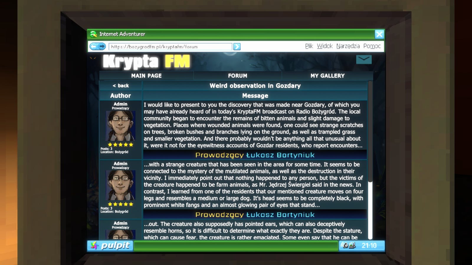 Как фанат, я бы описал Krypta FM как гениальную исследовательскую игру, действие которой происходит в двух взаимосвязанных мирах бесплатно. Первый — это современный маленький городок Польши, наполненный заброшенными железнодорожными станциями, извилистыми темными лесными дорогами и тускло освещенными уличными фонарями. Второй — 2006 год, который переносит вас во времени с его громоздкими цифровыми камерами с ненадежными батареями, жаркими дебатами на досках объявлений о «сетевом этикете» и настольными компьютерами, где до сих пор доминирует Frutiger Aero. Эта игра представляет собой уникальное сочетание впечатлений: она одновременно жуткая и ностальгическая, пугающая, но иногда и милая.