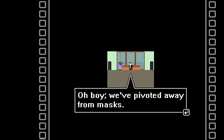 Пускать дым в дроны и статуи, конечно, выглядит довольно абсурдно, не правда ли? Вообще говоря, Mask Quest балансирует на грани своего юмора. Становится смешно, когда случайно падаешь в воду и при приземлении приходится выплевывать всю воду. Это абсурд, напоминающий Чарли Чаплина в приступах кашля, когда он прыгает сквозь слезоточивый газ, даже когда оставшаяся насыщенная кислородом кровь утекает. Диалог абсурден: протестующие выкрикивают что-то вроде «нет ты». Однако неряшливый юмор никогда не затмевает резкости. Это отражает несправедливость. Ты мишень каждой шутки.