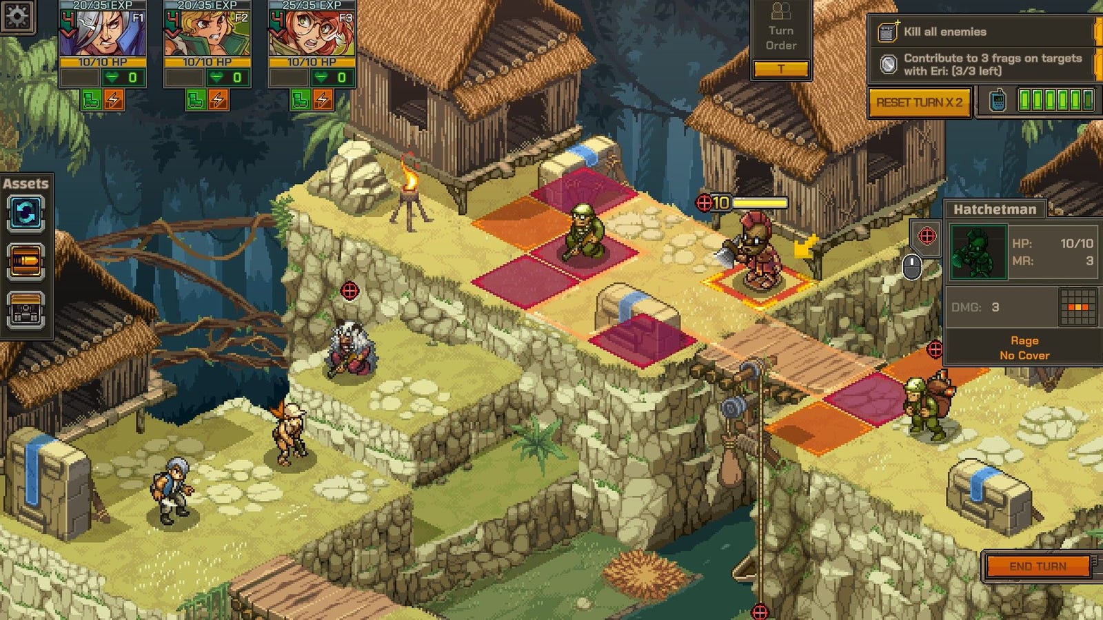 Metal Slug Tactics намеренно скрывает движения врагов, раскрывая о них меньше информации. Это приводит к появлению уровней в стиле исключения с большей свободой, но также делает миссии по сопровождению и защите непредсказуемыми и разочаровывающими из-за их частого характера. Вы часто будете не уверены в следующем шаге Руми. Следовательно, я обнаружил, что вообще избегаю этих миссий, выбирая более простые миссии по «уничтожению целей», даже когда предлагались заманчивые награды, такие как опыт персонажа, монеты за части оружия или танки, которые можно мгновенно развернуть. Однако эти стимулы становятся незначительными, если миссия проиграна из-за того, что противник решил атаковать шахтера вместо взрывной приманки поблизости.