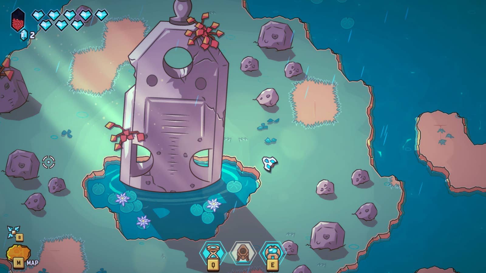 Поначалу мне удалось крепко ухватиться за игру — хоть у нее и нет ни ног, ни конечностей, это было скорее метафорическое высказывание — вырисовывалась последовательная закономерность. Я исследовал пещеры, каждая из которых напоминала подземелье в стиле Zelda, и участвовал в серии битв, чтобы найти переключатели и ключи, которые облегчили мне продвижение по подземелью. Достигая конца каждого подземелья, я приобретал новые навыки, такие как замедление времени, запуск бомбы или полет над водой. Эти навыки добавили азарта в бой и дали мне больше возможностей открывать новые территории с собственными подземельями. По сути, я бы повторил этот процесс.