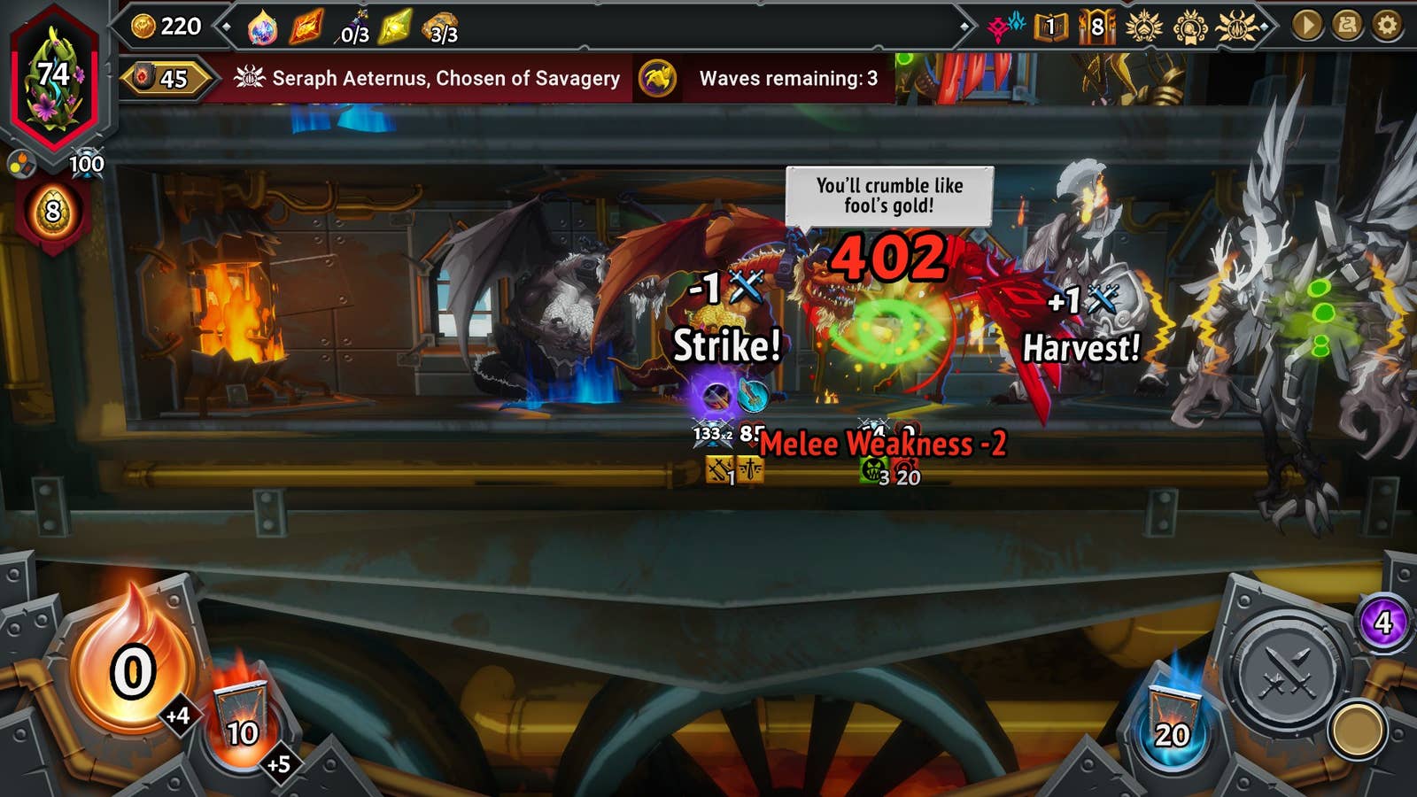 После этапа развертывания противники обычно появляются снизу и продвигаются вверх по уровням, участвуя в одной битве на каждом этаже до тех пор, пока не достигнут локального босса. Босс не следует правилу одной битвы за этаж: он должен уничтожить всех защитников на каждом уровне перед тем как продолжить. В конце каждого хода юниты автоматически атакуют первого встреченного противника, но вы можете вмешаться с помощью карт заклинаний, которые могут иметь различные эффекты, например, поджечь существ Pyrogelom для увеличения полученного урона или ошеломить их звездной пылью так что они пропускают свой ход.