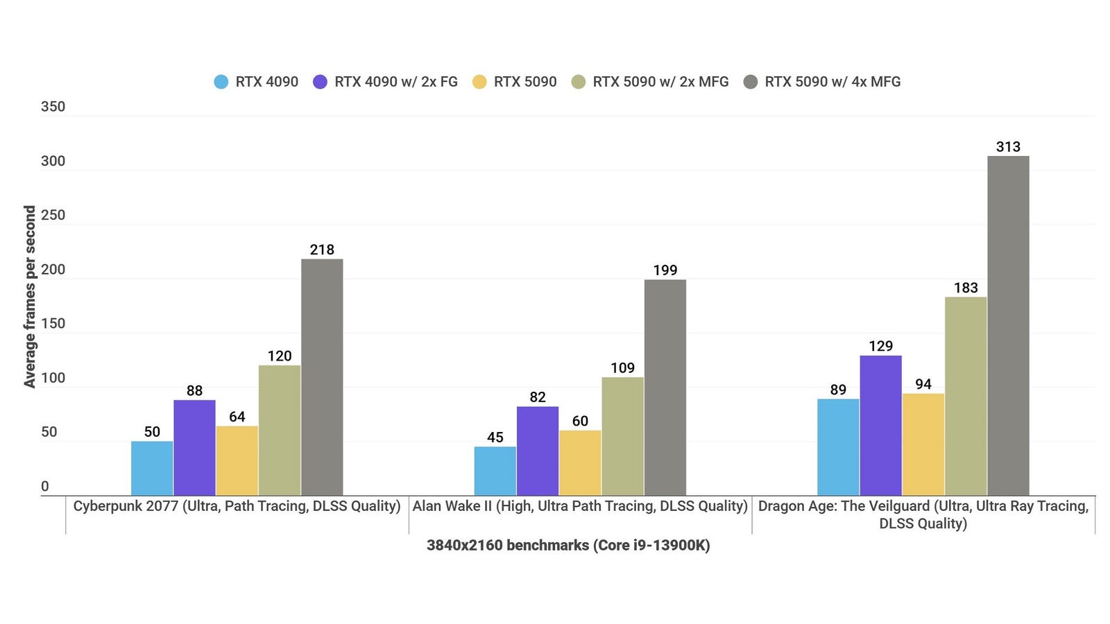 Как преданный энтузиаст игр, я снова не впечатлен производительностью RTX 3090 в этом разрешении. Новый RTX 5090, хотя и является технически модернизированным, кажется таким же мощным, как и его предшественник, с точки зрения чистой мощности. Есть проблеск надежды на трассировку лучей, но даже в этом случае частота кадров не совсем оправдывает повышение цен. Например, Cyberpunk 2077 с эффектами Psycho RT и Quality DLSS показал среднюю скорость 124 кадра в секунду на RTX 5090, тогда как RTX 4090 показала всего 111 кадров в секунду — разница всего в 11 кадров в секунду при значительном увеличении стоимости. Многокадровая генерация (MFG) здесь тоже не особенно полезна, поскольку из-за огромного количества создаваемых кадров большинству игр сложно извлечь выгоду из дальнейшей генерации кадров, не выходя за пределы человеческого восприятия.