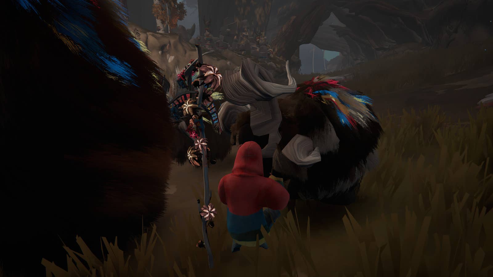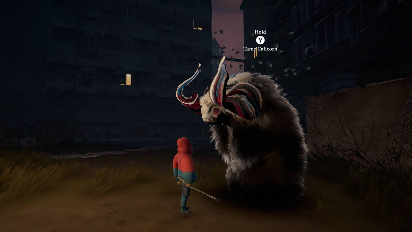 Покинув город, ваше путешествие приведет вас к спасению множества Каликорнов по пути к обещанной горе. Процесс приручения этих существ упрощен: часто вам нужно будет найти целебный плод для раненого Каликорна, чтобы завоевать его доверие, но обычно вы просто подходите и выполняете последовательность нажатий кнопок, похожую на менее ласковую игру Far Cry Primal. После приручения вы можете дать им имена самостоятельно. Я выбрал имена для всех своих из числа коллег, что было забавно, пока я не исчерпал список коллег и не начал называть их в честь недавних увольнений и сокращений в Rock Paper Shotgun.