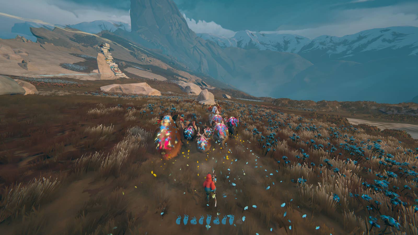 В вашем мире Каликорны идентифицируются по оттенкам синего, желтого и красного. Эти цвета не только маркируют их, но и пронизывают окружающую среду, подчеркивая немногочисленные безделушки. Индикатор, наполненный синими цветами, позволяет вам вызывать ветер и провоцировать бегство стада, либо ради удовольствия, либо чтобы подтолкнуть его к ледяному леднику. Красные цветы мгновенно инициируют или продлевают бегство стада; они функционируют как ускорения в Mario Kart. Желтые бутоны наделяют шерсть творческой жизненной силой, которую можно высвободить, чтобы восстановить старые фрески, открывая проходы в определенных руинах, которые связаны с видениями древних преданий Каликорнов и их пастырей. Неизменно, основные цвета повторяются во всех этих руинах, как будто сам ландшафт является шкурой Каликорна.