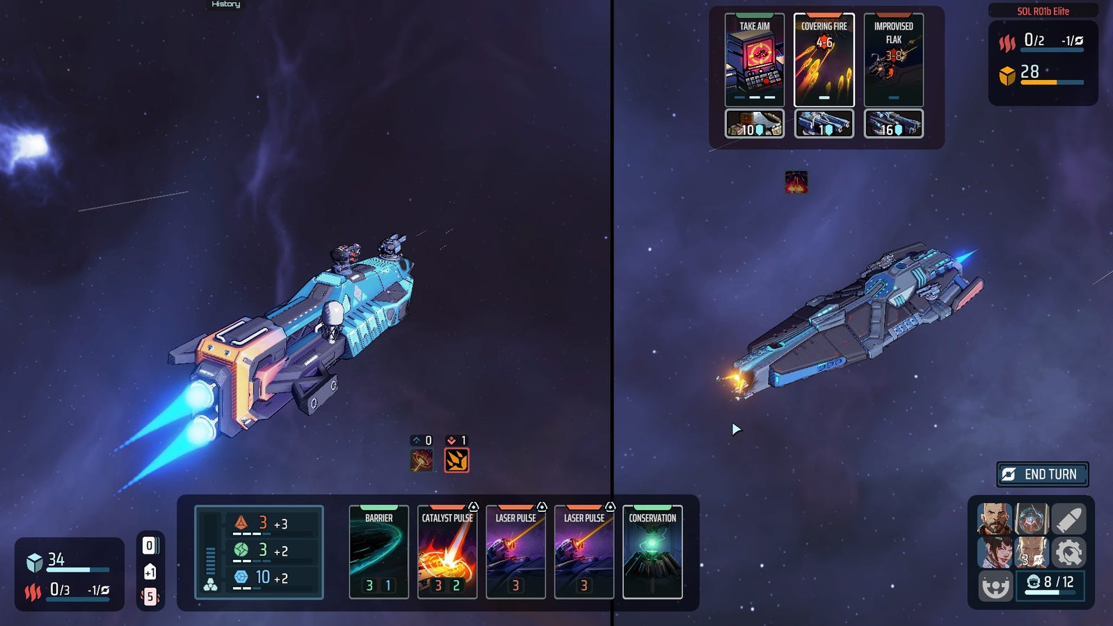 Карты предлагают хорошо известное сочетание возможностей атаки, защиты, помощи и контроля ресурсов. Однако каждая карта идеально подходит для определенных стратегий, и приятно видеть, как они дополняют друг друга. Поочередно могут быть запущены различные варианты импульсных лазеров, что приведет к снижению затрат или увеличению ущерба при последующем выстреле. Как точное оружие, эти лазеры также могут нацеливаться на отдельные компоненты корабля, делая их бесполезными, что временно ограничивает доступ вашего противника к определенным колодам карт.