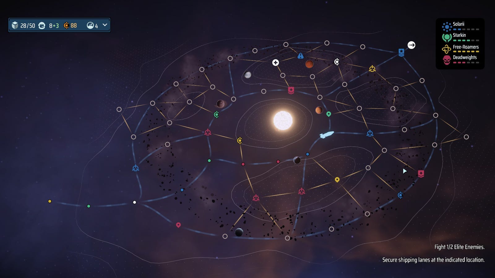 Во время вашего путешествия вы приобретете или потеряете знакомых, преследуя свои личные цели, зарабатывая или теряя расположение различных групп. От этого зависит, будут ли люди приветствовать вас тепло или мешать вам в нескольких шагах. Привлекательность сокровищ (дополнительные карты и кредиты для улучшения вашего корабля) или необходимость починить корпус корабля немного ограничивают вашу свободу. Однако количество, которое вы можете путешествовать, в первую очередь ограничено вашим запасом топлива, которое используется только при путешествии по извилистым звездным полосам с желтым оттенком — это помогает поддерживать разветвленную структуру игры-рогалика и не позволяет вам исследовать каждую локацию по своему желанию.