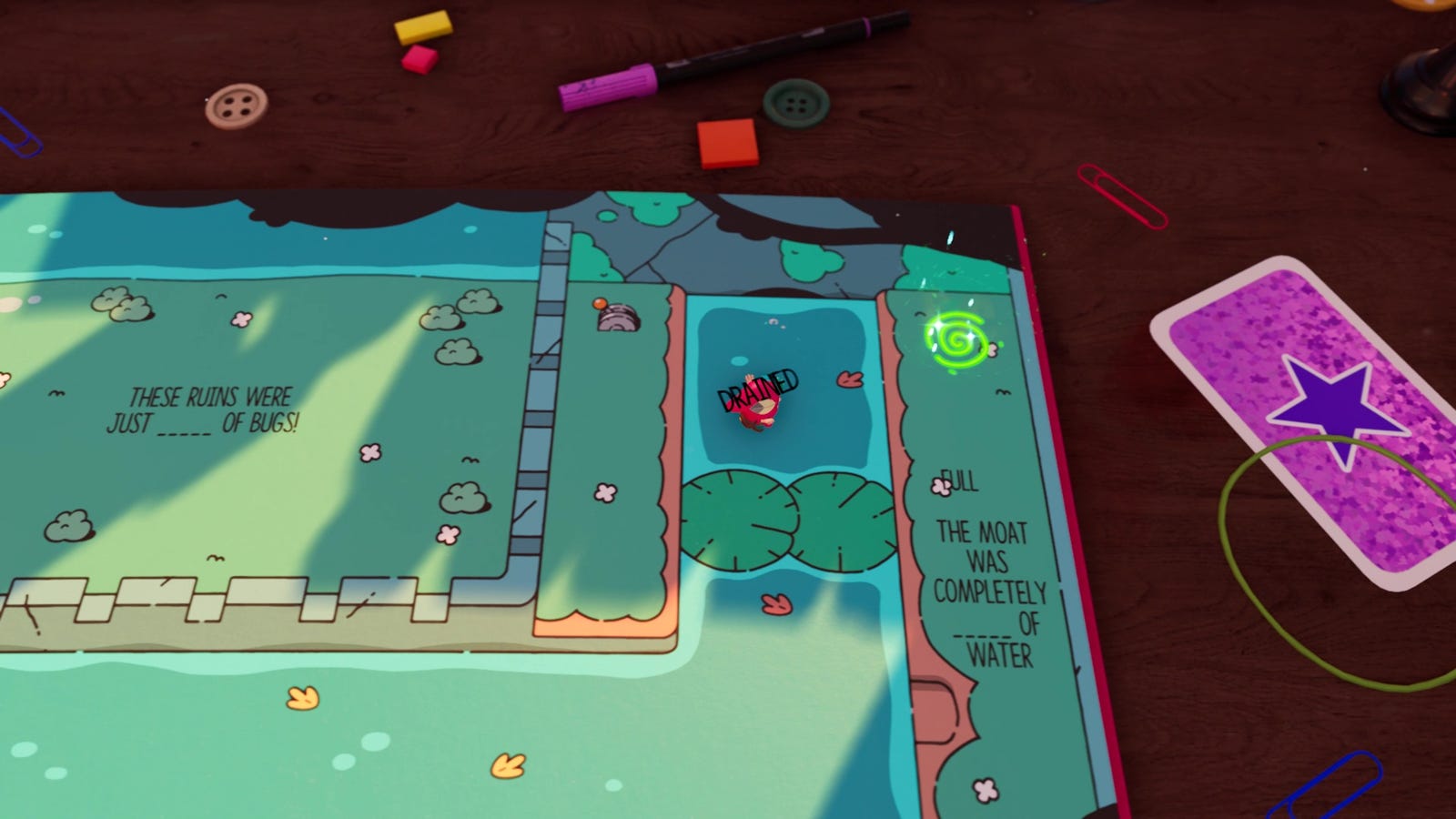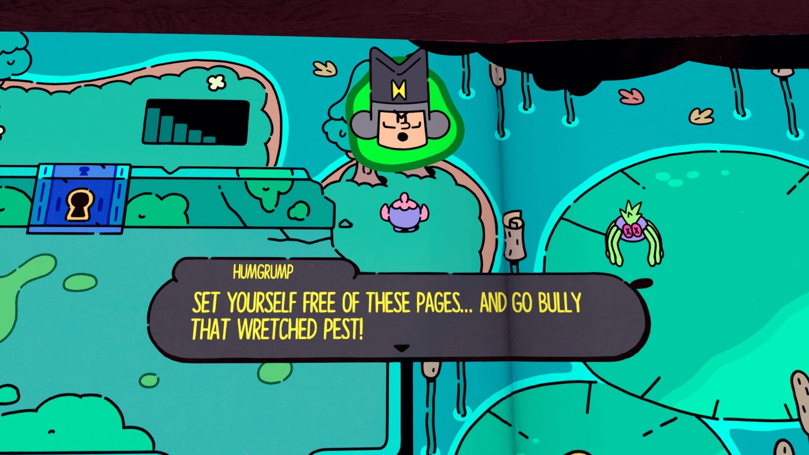 В эту коллекцию входят как книжные перчатки, которые позволяют переворачивать страницы, перемещая их в сторону или заставляя предметы катиться, так и штампы, создающие объемную взрывчатку или останавливающие перемещение предметов. Учитывая ваши существующие навыки изменения слов и навигации по страницам, кажется, что игра превратила ваш Jot в многофункциональное перо редакционной сферы; однако, как ни удивительно, это не так. К сожалению, озорство Humgrumps не перестанет мешать вашему творческому потоку.