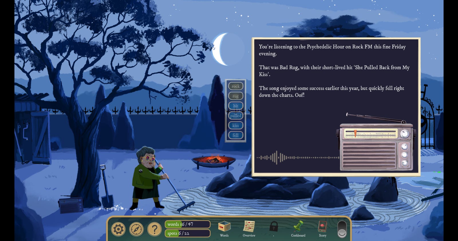 В начале фильма изображена грязная больница, где медсестра отчаянно движется к дубинке, в то время как пациент душит его ремнем. По мере развития истории нашей задачей становится понимание того, «кто», «что» и «где». Особое внимание уделяется различным предметам и точкам интереса, а их изучение добавляет соответствующие слова в наш словарный запас. Некоторые слова не имеют значения, другие нет. Например, бейдж с именем медсестры ясно раскрывает его личность, что может быть полезно для идентификации персонажей. Затем мы помещаем его имя под изображением, как это сделал бы агент Дейл Купер.
