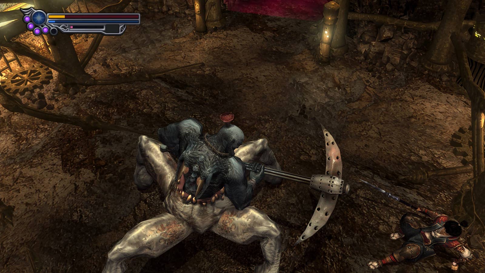 В первой битве первый противник говорит надменно как персонаж утреннего мультфильма выходного дня. Множественные ракурсы камеры стремятся раздавить вас падающими камнями. По мере развития боя ваш товарищ, вооруженный теппо, входит и произносит что-то вроде: «Я вернулся!». Когда битва завершается и босс исчезает в подземном мире, где он научился демонстрировать разрушающий эффект прыжковых атак через обучение, он говорит: «Я вернусь!».