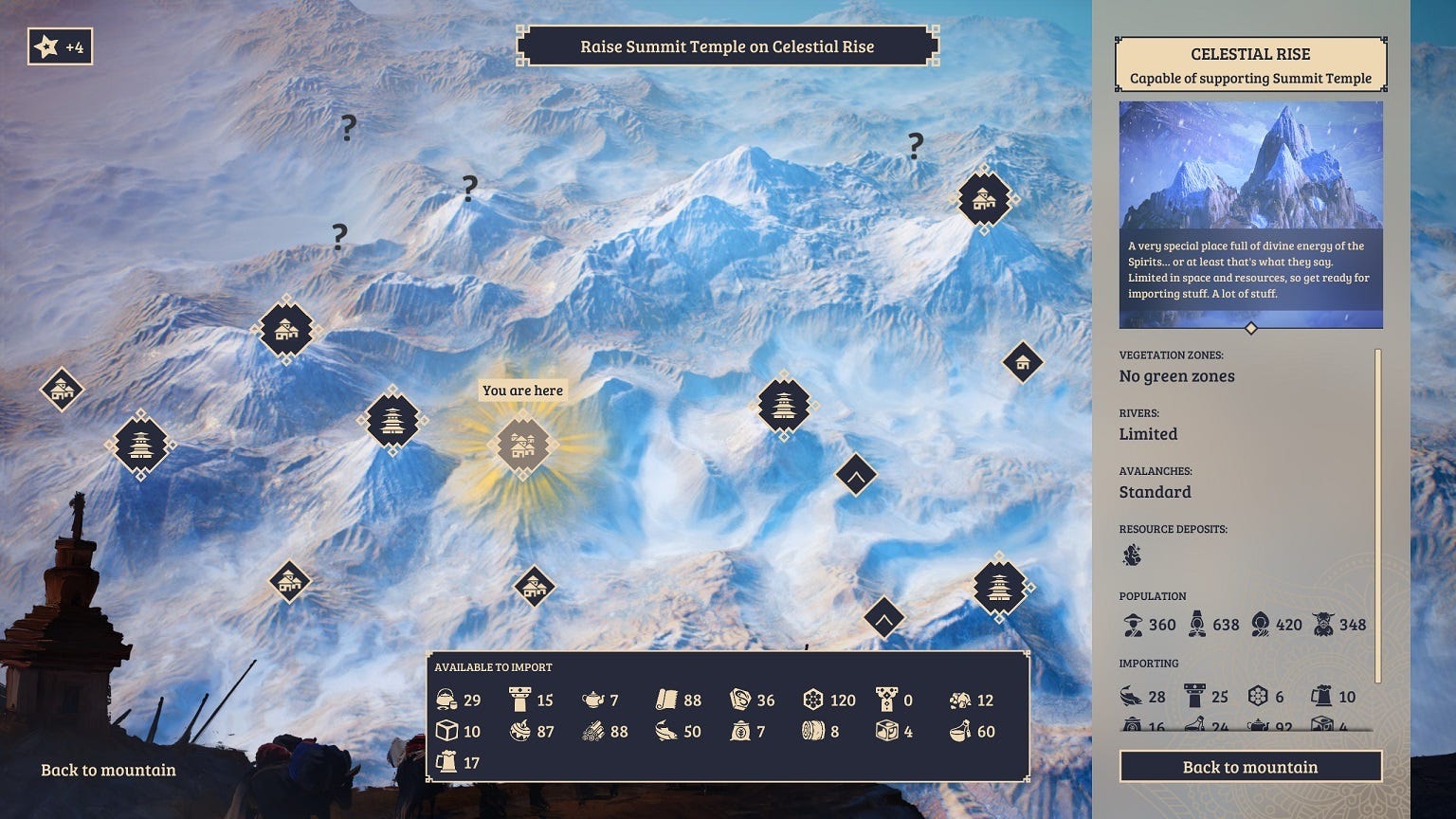 Проще говоря, режим песочницы в Steam предлагает карту мира для перемещения между различными городами. В начале вам будут доступны некоторые города, что позволит расширить сеть ‘пиковых городов’ путем строительства храмов на вершинах гор. Построение храмов также улучшает ваши возможности исследования во всей вашей империи. Журнал изменений Steam упоминает шесть новых горных локаций, напоминающих пропуски в песне ‘Двенадцать дней Рождества’. Если бы они упомянули предгорья хотя бы в сноске, я мог бы пошутить по этому поводу!