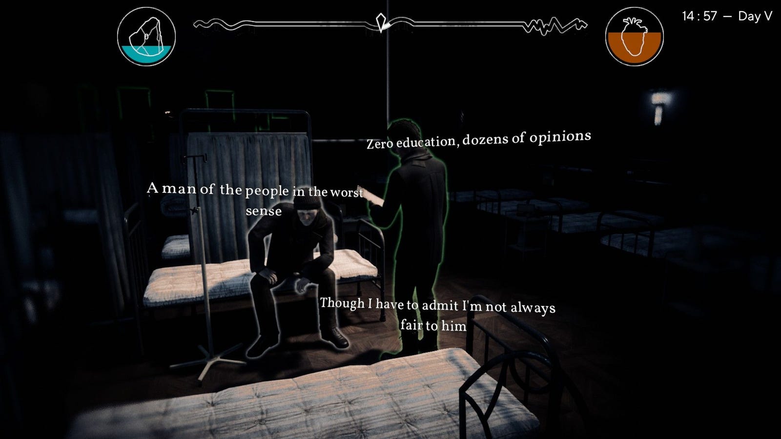 Значительный аспект демонстрации, который еще предстоит полностью раскрыть, – это концепция путешествия во времени. Сюжет фокусируется на враче, борющемся с болезнью в течение двенадцати дней. В определенные моменты вы сможете перематывать время и возвращаться к предыдущим дням. Однако этот навык требует специфического ресурса под названием Амальгама, который можно получить только через успешную эвтаназию и разбивание зеркал (в более простых терминах: вы приобретаете вещество для путешествий во времени, принимая участие в мини-игре эвтаназии, где помогаете облегчить страдания умирающих людей на улице с помощью морфина или аналогичных препаратов. Как это происходит конкретно, остается вашим воображением.)