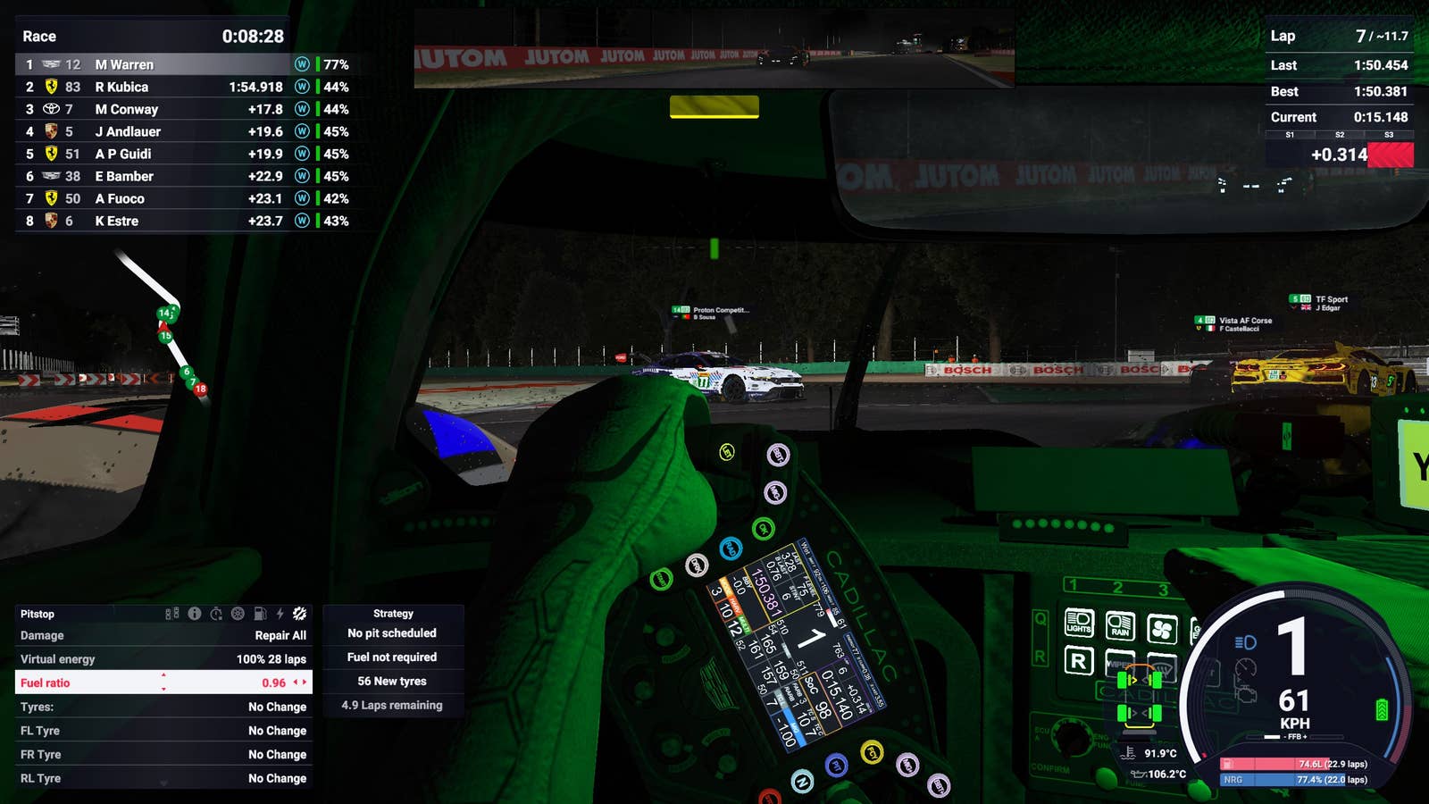 Во время игры я обнаружил, что водители-ИИ — приятные соперники для соперничества. Их можно настроить по своему усмотрению, и до сих пор мне не удавалось проиграть из-за их действий, за исключением одного раза в крайне влажных условиях, когда скользивший GT3 неожиданно врезался сзади в мой Cadillac. Однако кажется, что ИИ-водители склонны терять контроль над машиной при сильно мокрых дорогах. В гонках под сильным дождем я часто сталкивался с тем, как GT автомобили срывались на каждом повороте. Однажды во время гонки на COTA обнаружил половину поля разбросанной по трассе после заднего пряма.