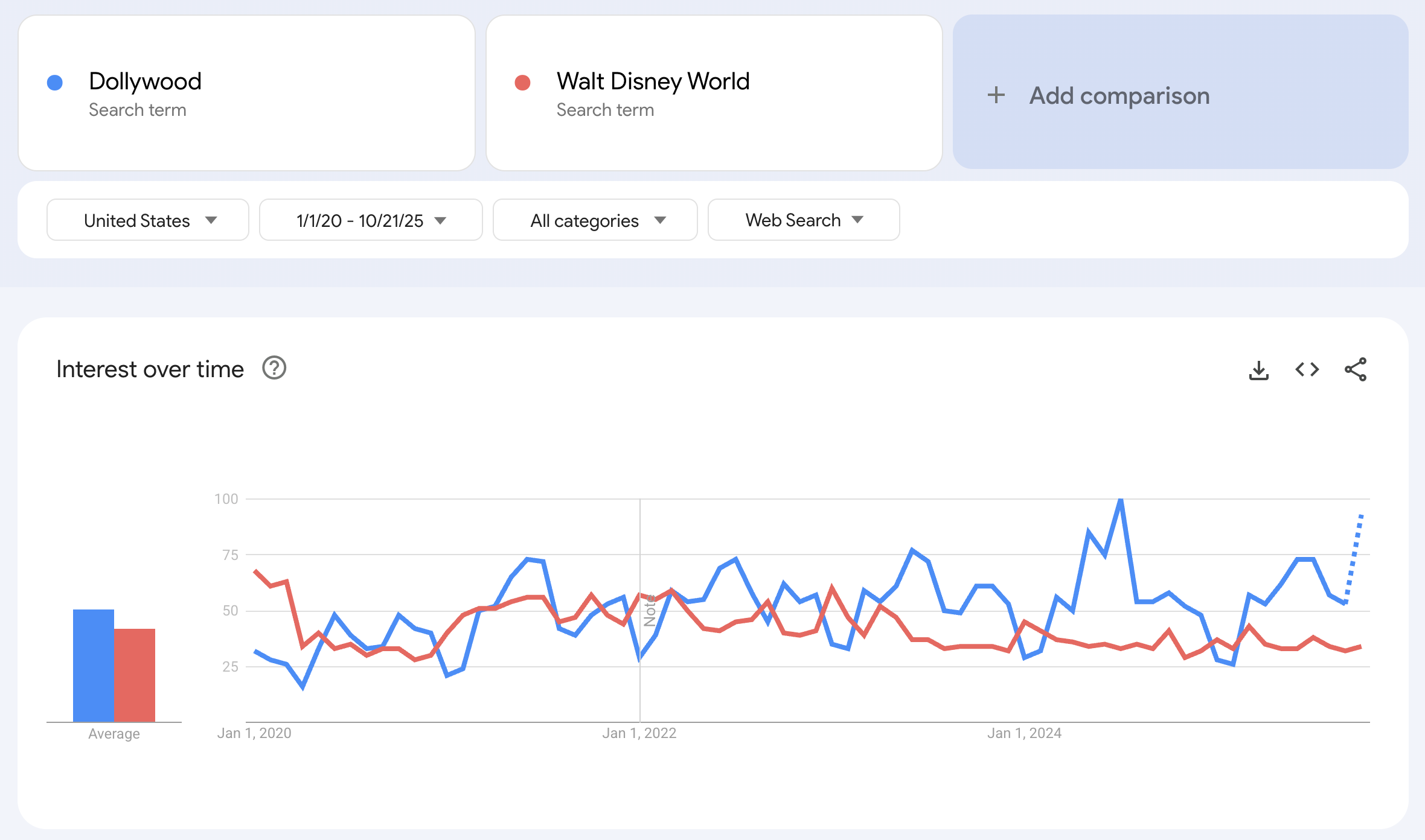 Интерес к Dollywood резко возрос с 2020 года, согласно данным Google Trends. Количество поисковых запросов почти утроилось, увеличившись на 191% за пять лет, с показателя 32 до 93. В то же время, количество поисковых запросов по Walt Disney World постепенно снижается, что отражает аналогичное падение посещаемости, отмеченное Forbes.