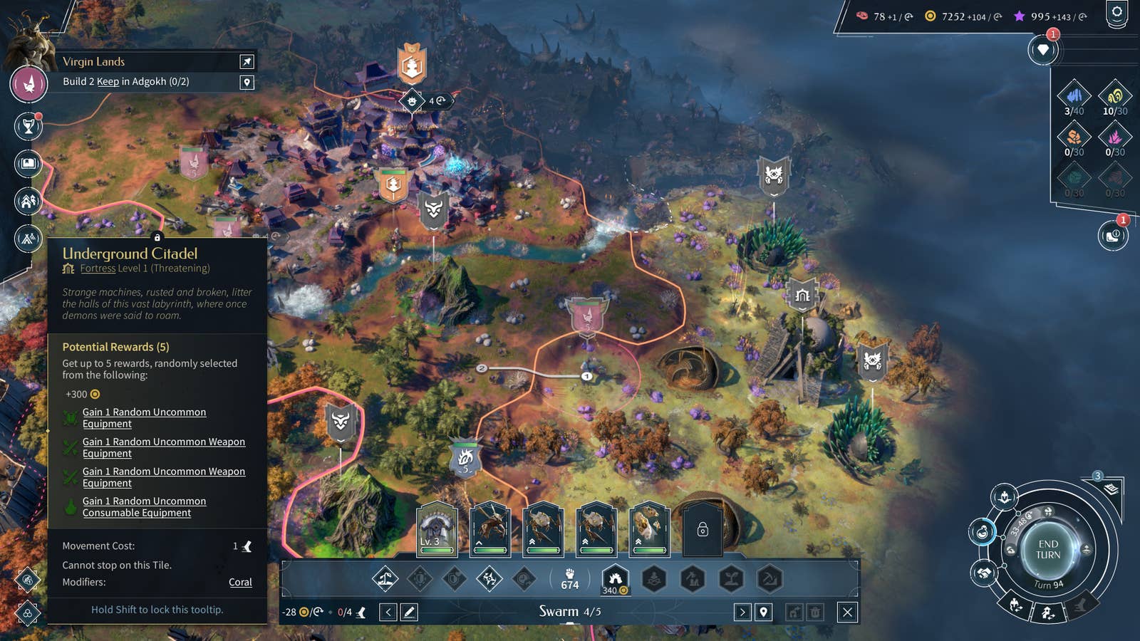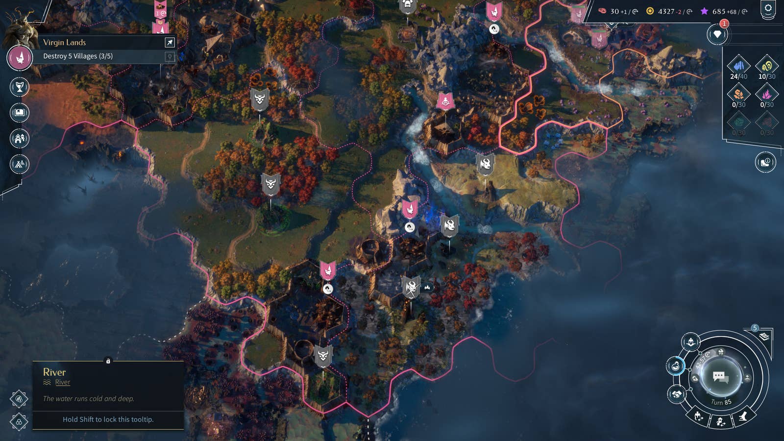 Игровая карта состоит из областей, которые вы можете захватить, строя поселения. Вы также найдете множество небольших деревень, принадлежащих незначительным группировкам — вы можете либо уничтожить эти деревни, чтобы устранить проблемные армии, либо умиротворить их, чтобы получить новые типы юнитов. Существует пять основных ресурсов, которыми нужно управлять. Производство используется для строительства, а Продовольствие увеличивает вашу популяцию, что, в свою очередь, ускоряет сбор других ресурсов. Влияние позволяет вам расширять свои города и развивать новые территории. Наука открывает исследования, а Пыль действует как своего рода магическая валюта, позволяя вам мгновенно завершать строительные проекты и многое другое.