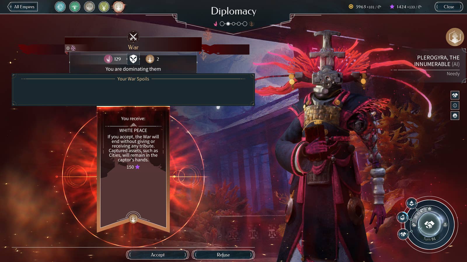 Если вы играете за Аспект и обнаружили поблизости растущий улей Некрофагов, вам нужен план Б. Эти существа, вероятно, не будут рассудительны, поэтому подготовьтесь с сильной армией, хорошими союзниками или большим количеством денег. Мои друзья, играющие за Аспекты, не имели плана Б, и их быстро захватили. После объявления войны — которая проходит легче, если ваш народ уже агрессивен — я уничтожил их менее чем за 10 ходов.