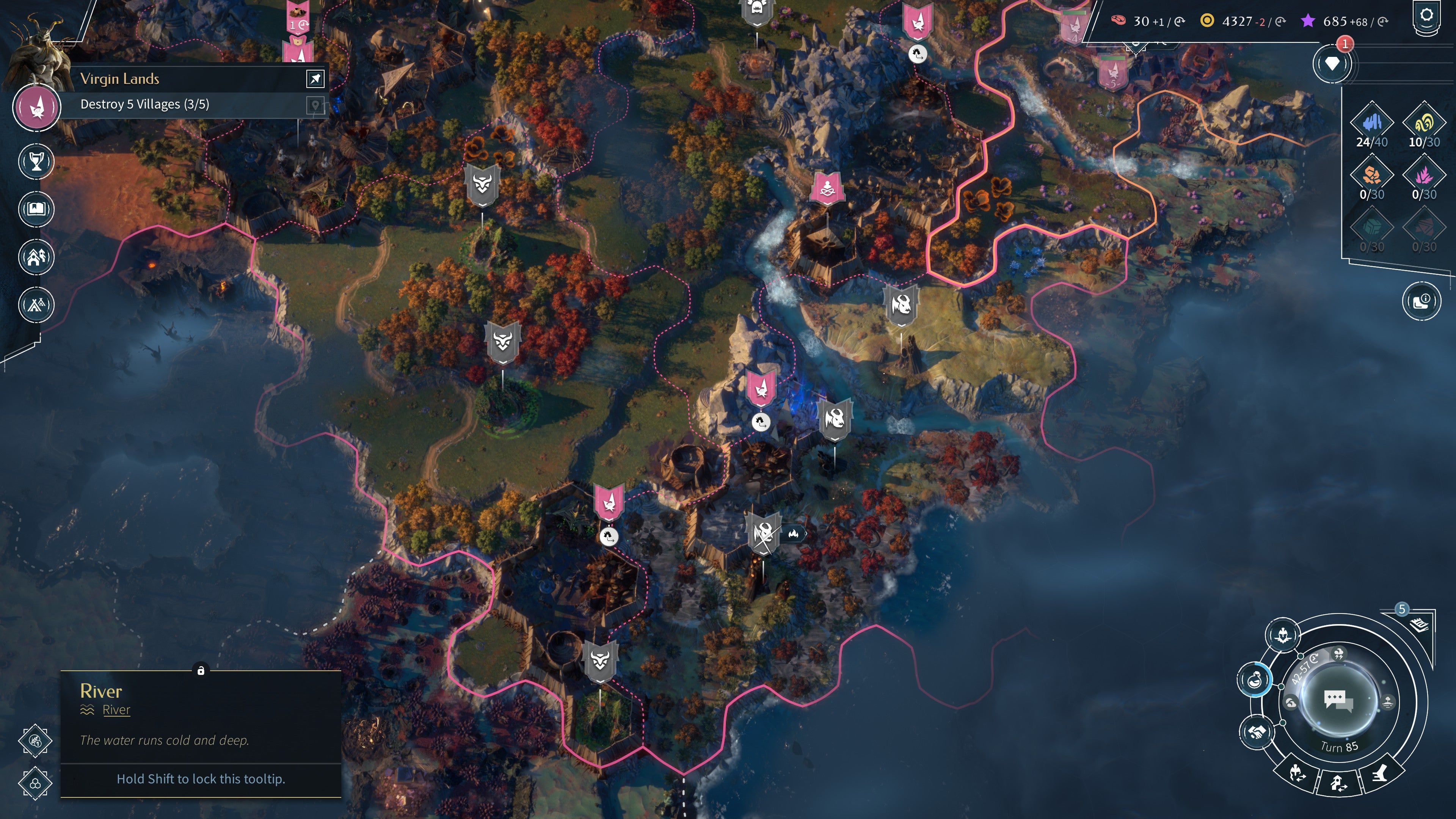 Игровая карта состоит из областей, которые вы можете захватить, строя поселения. Вы также найдете множество небольших деревень, принадлежащих незначительным группировкам — вы можете либо уничтожить эти деревни, чтобы устранить проблемные армии, либо умиротворить их, чтобы получить новые типы юнитов. Существует пять основных ресурсов, которыми нужно управлять. Производство используется для строительства, а Продовольствие увеличивает вашу популяцию, что, в свою очередь, ускоряет сбор других ресурсов. Влияние позволяет вам расширять свои города и развивать новые территории. Наука открывает исследования, а Пыль действует как своего рода магическая валюта, позволяя вам мгновенно завершать строительные проекты и многое другое.