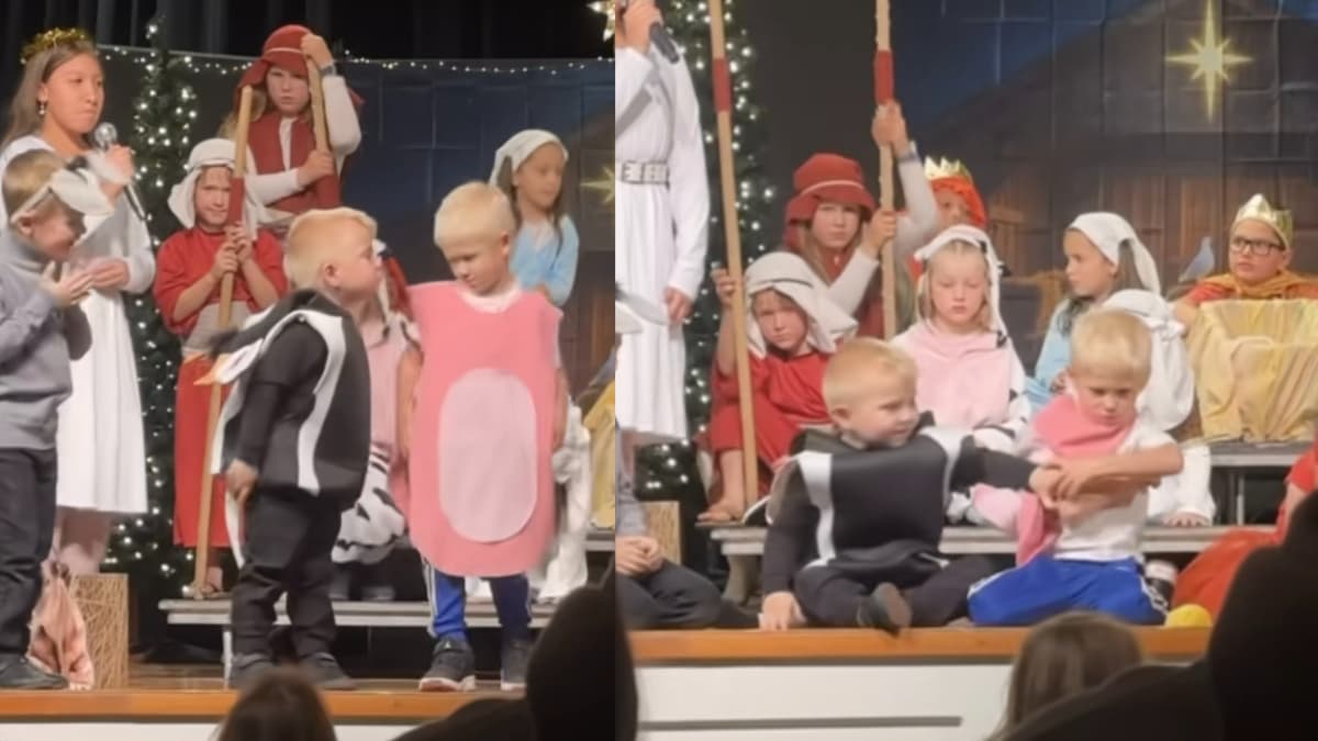 Как родитель, я всегда люблю смотреть школьный рождественский спектакль – это так мило видеть, как дети разыгрывают рождественскую историю! Но в этом году в одной школе в Неваде всё пошло забавно не по плану. Кто-то снял двух маленьких парней – один был одет как бык, другой как свинья – которые совершенно забыли свои роли и просто начали дурачиться друг с другом. Мы не знаем, что их заставило это сделать, но они бросили весь спектакль и просто начали игриво шлепать друг друга по костюмам! Это не была драка, просто глупый, неожиданный момент, который всем показался совершенно забавным. Это определённо не было традиционным рождественским представлением, но оно, безусловно, украло шоу!