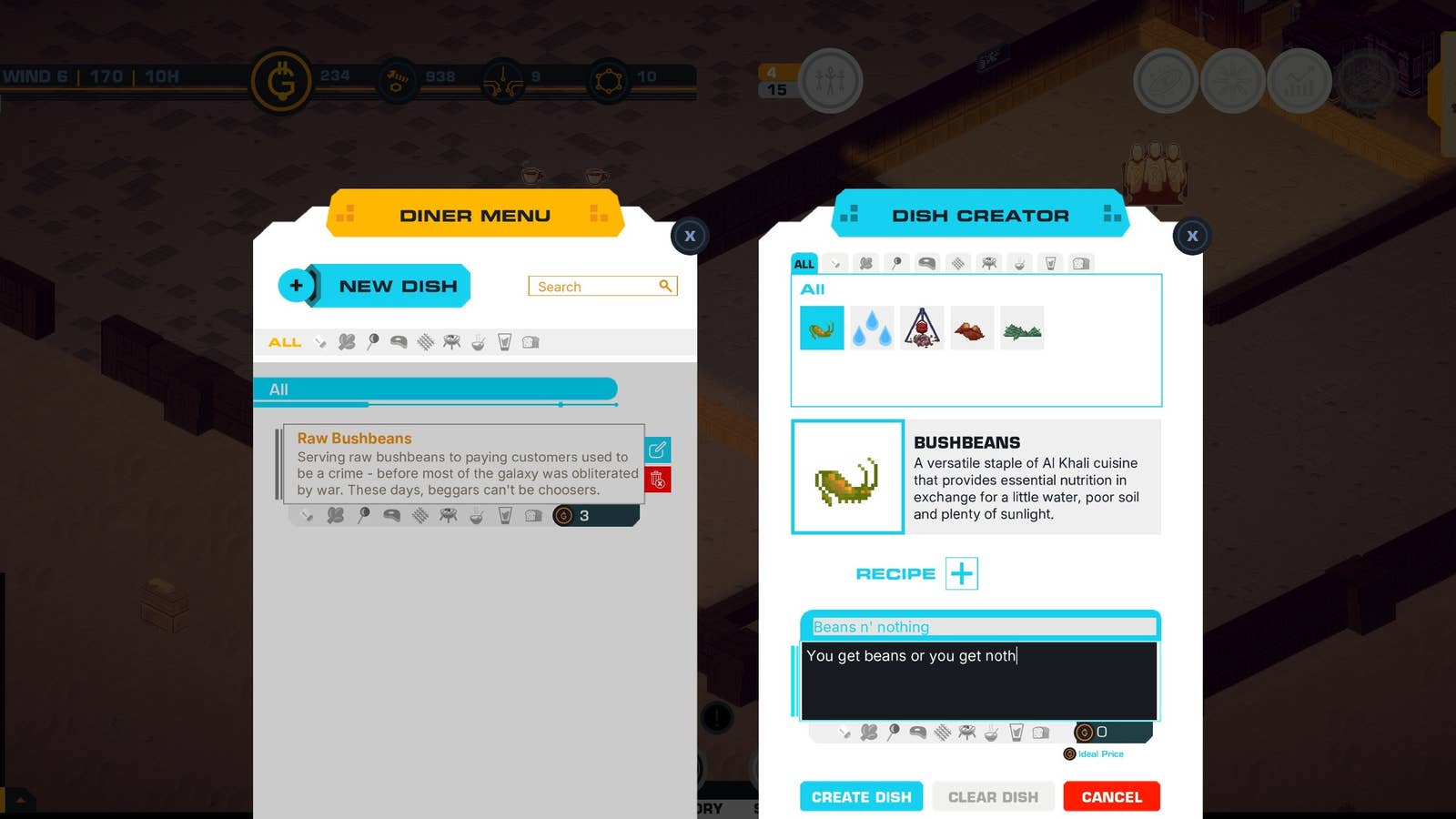 На страницах Steam и Itch.io игры «Diner at the End of the Galaxy» с гордостью объявляют, что вы можете выращивать редкие ингредиенты, разрабатывать меню для искушения вкусовых рецепторов пришельцев и раскрывать скрытые богатства далеких галактик! После создания своей кухни и небольшого участка для выращивания культур я узнал, что могу изобретать собственные блюда. Интересно, однако, что «бобы» уже присутствуют в предлагаемом меню.