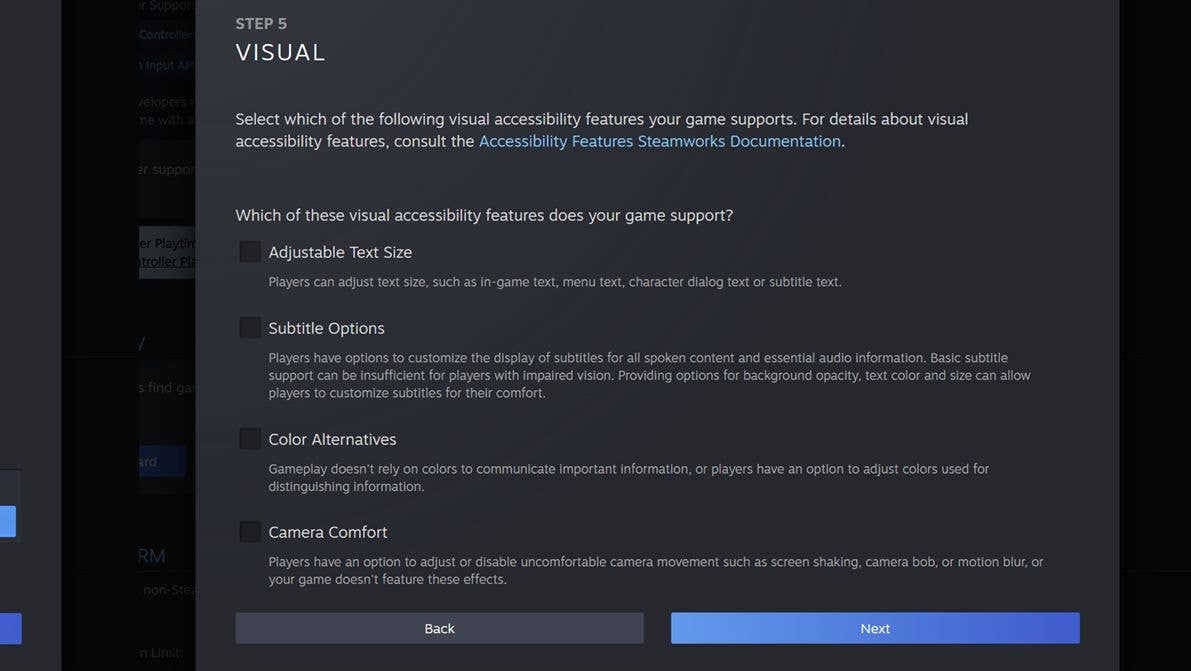 Для обеспечения бесперебойной работы разработчики должны добровольно предоставлять информацию о встроенных в их игры возможностях доступности. Это можно сделать путем заполнения последовательной формы, находящейся во внутренних механизмах (бэкенде) Steam.