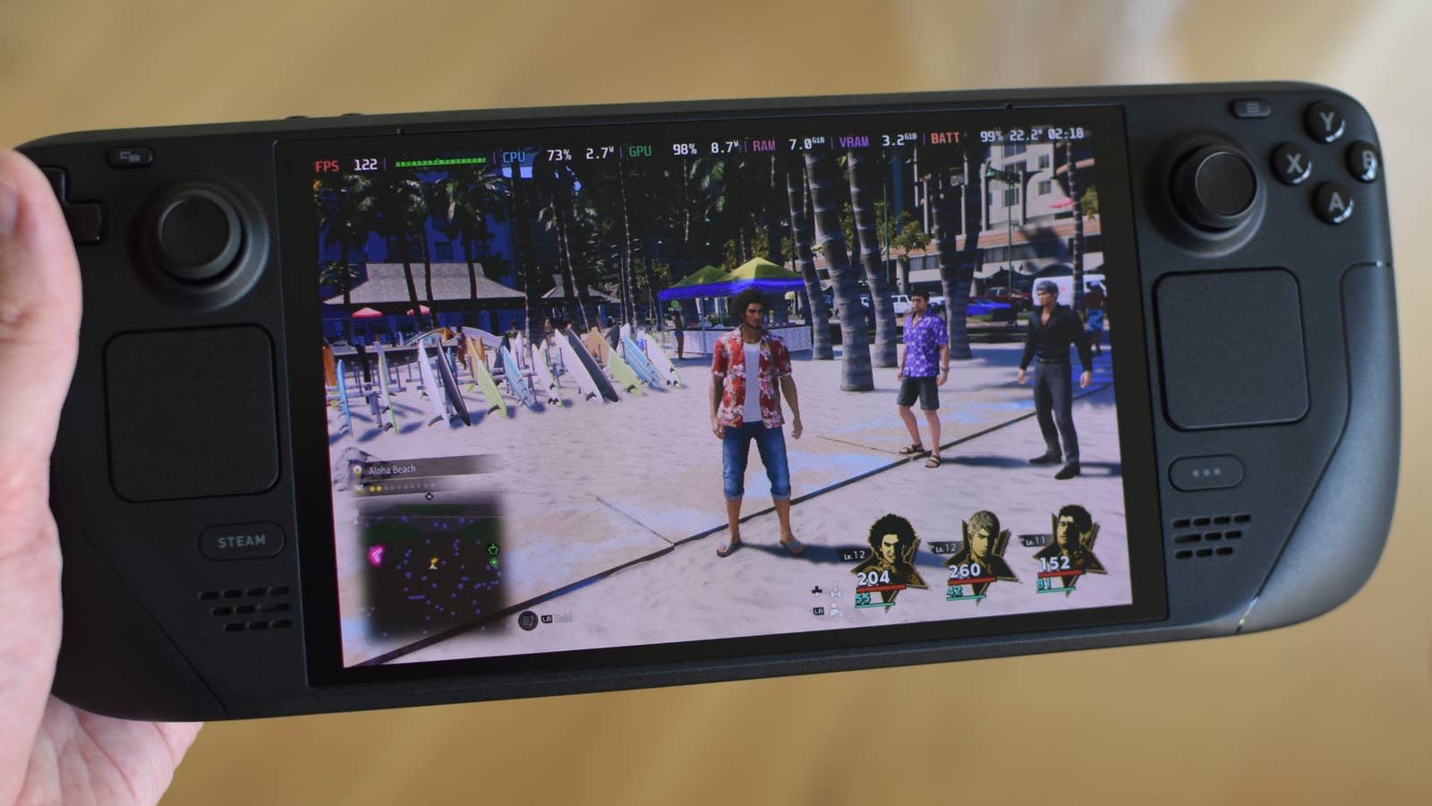 Вместо того чтобы сказать ‘Лучше всего было Like a Dragon: Infinite Wealth’, вы могли бы выразиться так: ‘Игра Like a Dragon: Infinite Wealth показалась мне особенно примечательной’. На настройках среднего уровня я столкнулся с фреймрейтом от 36 до 45 кадров в секунду при исследовании открытого мира Гавайев. Этот показатель значительно улучшился до 91-124 кадров в секунду благодаря технологии генерации трех кадров, что было настолько высоким значением, что OLED экран Steam Deck не мог поддерживать эту частоту обновления. Игра также продемонстрировала заметное улучшение визуальной плавности. Если был заметен увеличение времени задержки ввода, то это было легче игнорировать в пошаговой RPG по сравнению с динамичной игрой Doom, шутером от первого лица.