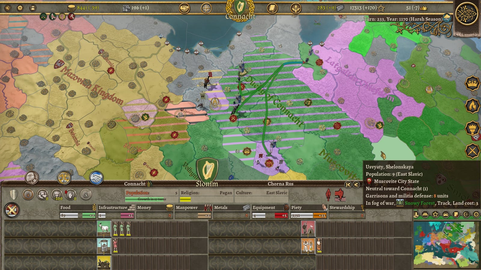 Текст строительной панели привлекателен, но он не обеспечивает необходимой информации о предварительных условиях и соединениях. Карта могла бы выиграть от расширенных и интерактивных слоев, поскольку управление трудом и разделением армии излишне усложнены. Кроме того, королевства, похоже, неожиданно реформируются или разделяются, что еще больше усугубляется их своеобразными обычаями именования. Например, Неаполь формируется в Болгарии, принимает название Польша (которое должно быть Малой Польшей, расположенной в Беларуси) и объявляет войну Богемии, региону в России. Вассализация вашего дяди может привести к тому, что он перейдет чужую культуру и титул из далеких стран, даже тех, которые находятся в сотнях миль от его первоначальной культуры. Я отплыл из Коннахта и объединил Альбу в герцогство, чтобы ты не переименовывал его в Йорк, Найл. Кто дал вам полномочия вызвать Йорка к жизни?