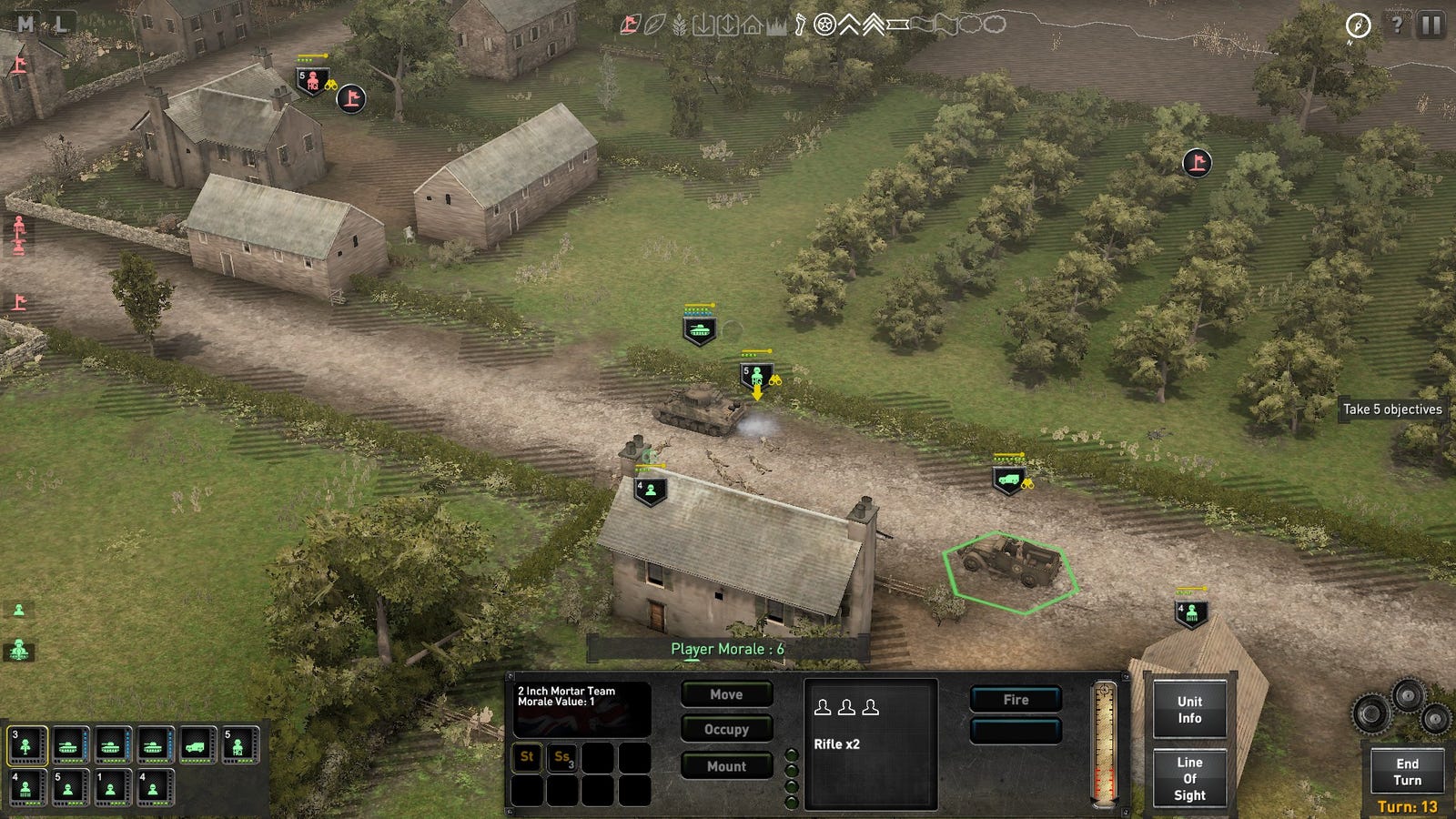 У меня есть несколько проблем с игрой. Это может быть несправедливо, когда противник делает первый ход, что приводит в уныние на этапе защиты. Бывают случаи, когда мои устройства загадочным образом уничтожались, хотя машины не были повреждены, и наоборот. Еще огорчает то, что я не могу восстановить пилотируемую технику в кампании. Индикаторы прямой видимости и дальности могли бы быть более удобными для пользователя, а вражеские минометы кажутся чрезмерно смертоносными, уничтожая целые отделения внутри зданий, в то время как моим многочисленным группам корректировщиков едва удается уничтожать одного вражеского солдата за каждый второй ход. Функция сохранения значительно улучшит впечатления. Хотя я уважаю необходимость жить с ошибками, время, потраченное на расстановку армий на позиции перед каждой миссией, кажется утомительным. Для пехоты этот процесс может занять целый ход только для того, чтобы преодолеть изгородь, а для этого часто требуется три хода, чтобы перелезть через нее и уйти от нее. Сохранение «Начало миссии», к которому можно вернуться после настройки, будет особенно полезно в миссиях, где необходима сложная подготовка к обороне.