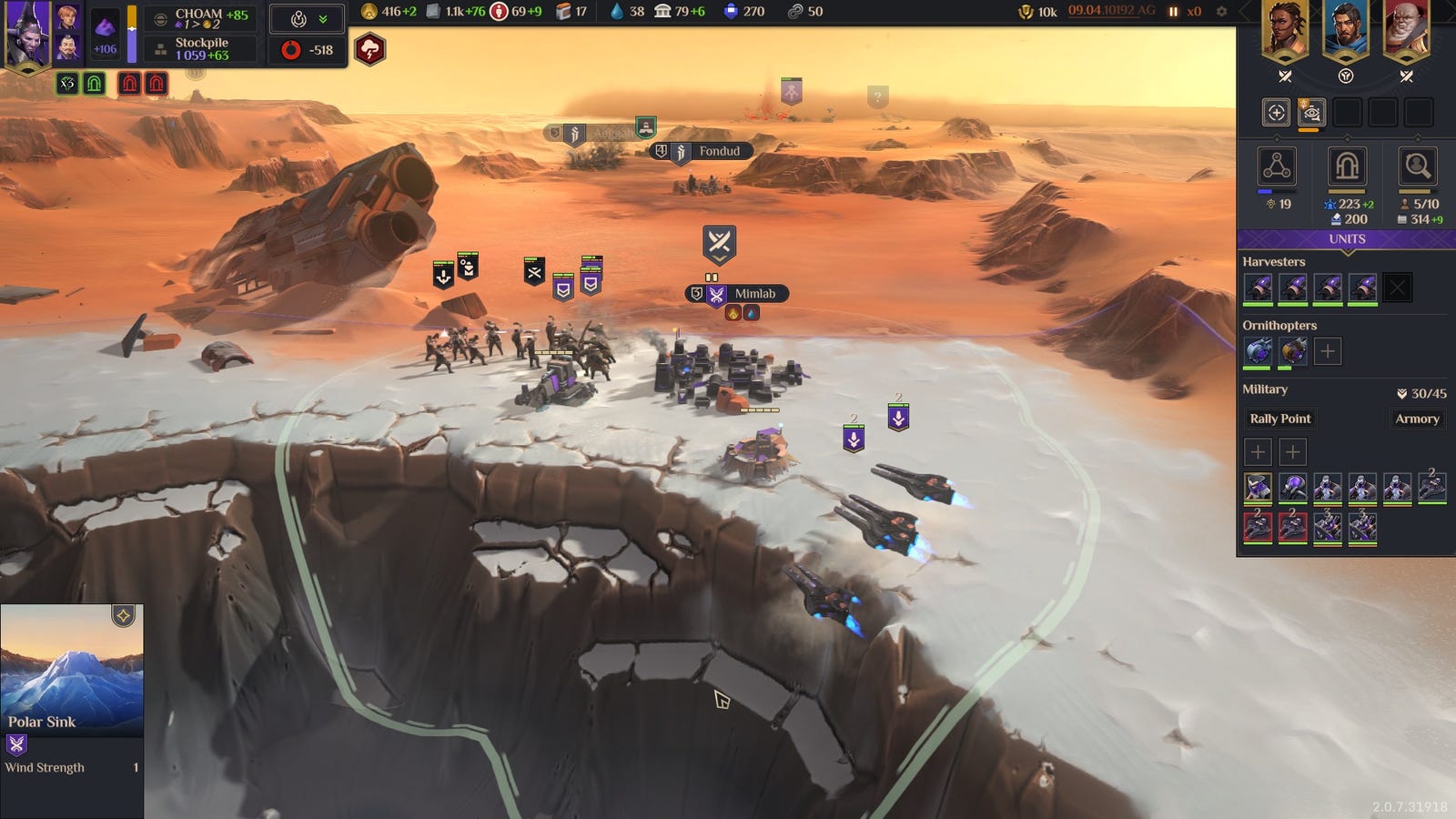 Основное внимание уделяется полю битвы, которое движется в неторопливом темпе и избавляет игроков от типичных задач RTS. Меньшие армии и сложные системы снабжения добавляют элемент стратегии, а расширение является тщательным и многогранным решением для всех участвующих сторон. Для Эказ контроль территории имеет первостепенное значение для их существования. С другой стороны, Верниусы, представленные в недавних DLC, должны расширять свое влияние тонким, но угрожающим образом, взвешивая трудный выбор по поводу отказа от определенных областей. Вместо того, чтобы полагаться на значительную исследовательскую мощь для укрепления или доминирования, они могут использовать ее для расширения власти Ландсраада или даже получать преимущества, воздерживаясь от исследований. Наконец, они имеют характерный фиолетовый цвет, что обеспечивает их правильную идентификацию.