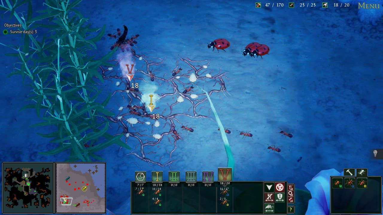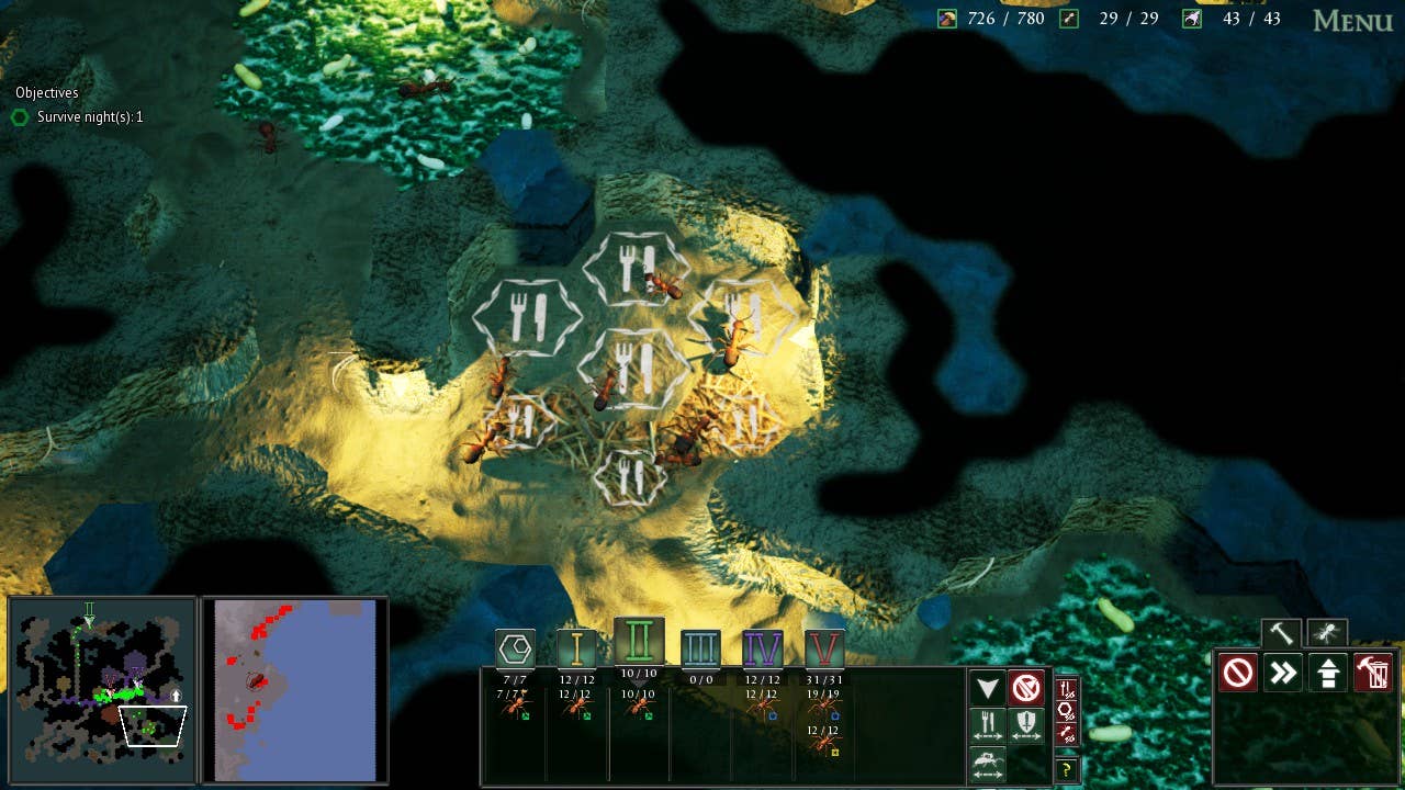 Вместо прямого управления или обучения ваших муравьев традиционные методы, такие как перетаскивание квадратов или использование команд ctrl+ не применимы. Вместо этого вы можете управлять пятью различными группами (одна группа остается дома) с ограниченным прямым контролем над каждой из них. Вы можете отдать команду «идти сюда» и переключить несколько настроек — игнорировать бой и игнорировать пищу. Это позволяет муравьям действовать независимо в боевых ситуациях или искать пищу, но они не будут взбираться на большие угрозы или кусать их.