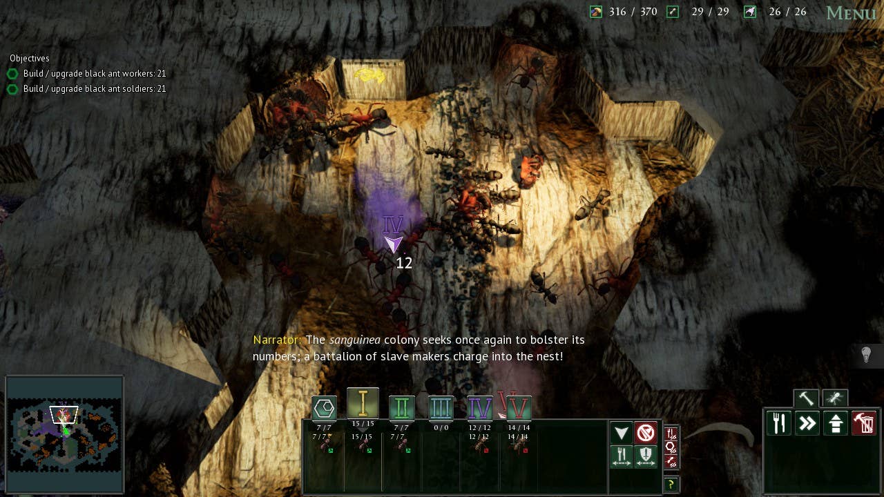Например, в этой игре муравьи не патрулируют территорию спонтанно и не имеют одиночных разведчиков, передвижной королевы или способности перемещать яйца. Здесь нет сбора муравьев-противников, удаления тел и забот о запасных королевах или спаривании. Все это кажется продуманными решениями, которые отдают приоритет стратегии, а не симуляции, делая борьбу за выживание муравейника более захватывающей, чем самоиграющая игра.