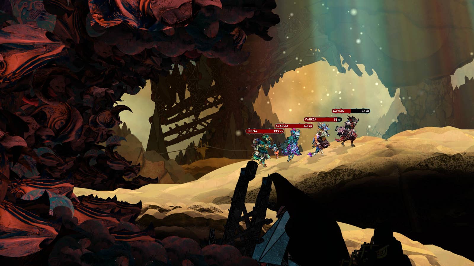 Ваши крошечные персонажи прогуливаются мимо возвышающихся статуй и руин, странных инопланетных лесов и пейзажей, ярких абстрактных небес, пересекая множество слоев параллакса. Время от времени земля дрожит под вашими подошвами, словно декорации во время антракта, создавая иллюзию движения. Несмотря на то, что вы не понимаете, что это такое и куда они идут, всё это потрясающе красиво. Вы можете подталкивать их двигаться быстрее, но редко это делаете. Это кажется неуместным, почти как будто спешка сквозь такие сцены уменьшит их очарование. Медленные, живописные части игры напоминают тщательно созданную диораму, кропотливо спроектированную за бесчисленные часы, чтобы наполнить ваш опыт чувством чуда и волшебства.