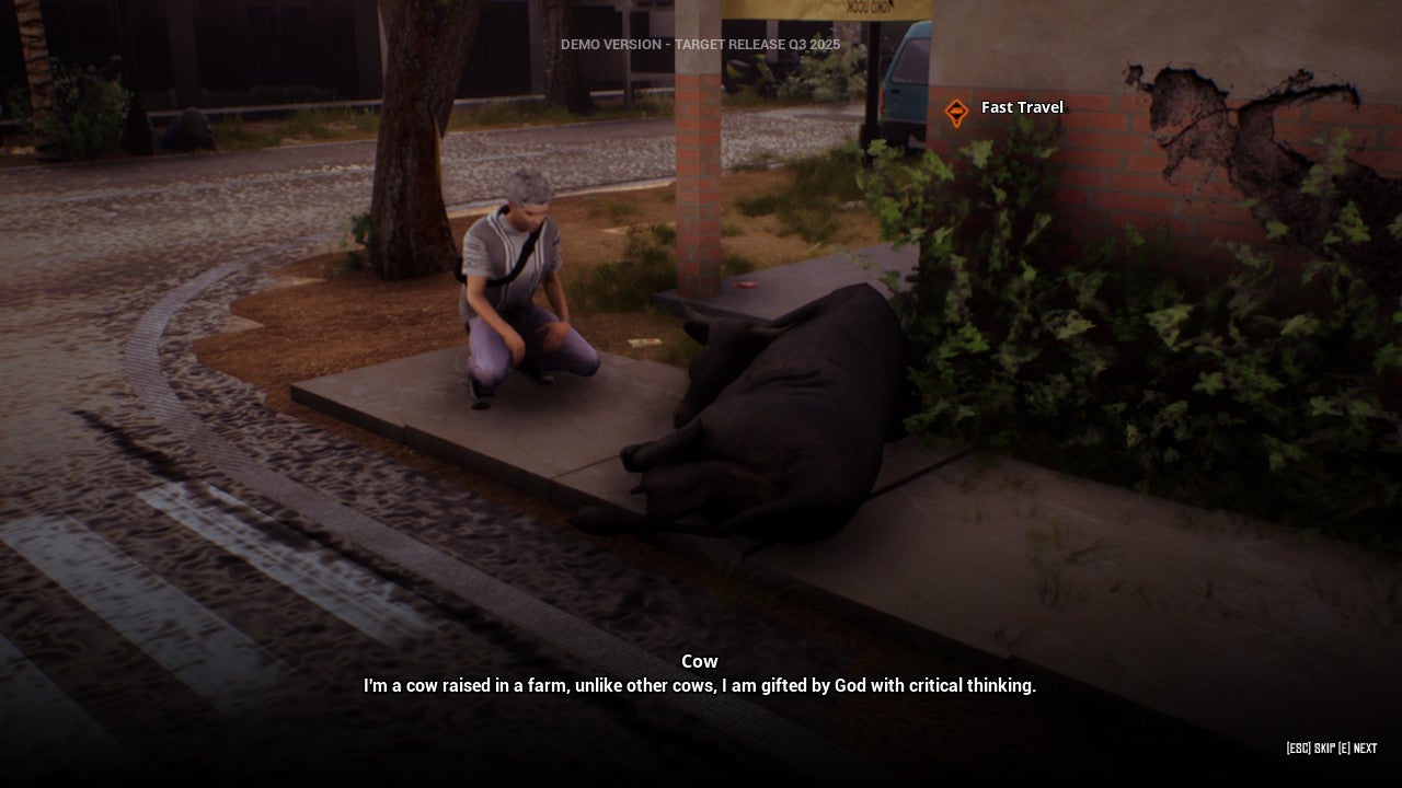 Я спросил корову, есть ли у нее какие-нибудь последние пожелания, и, на удивление, она попросила меня принять законы против коррумпированных политиков, которые воруют средства, предназначенные для таких вещей, как вышки 5G. Мне показалось, что я упустил какую-то шутку об индонезийской политике – даже в начальной надписи к игре слово «вымысел» было взято в кавычки. Поскольку я не мог реально принимать какие-либо законы в демо-версии, корова просто попросила меня помочь ей устроить разрушительный беспредел. Затем игра запустила мини-игру, в которой *я* управлял коровой, круша машины, которые лопались, как пузыри.