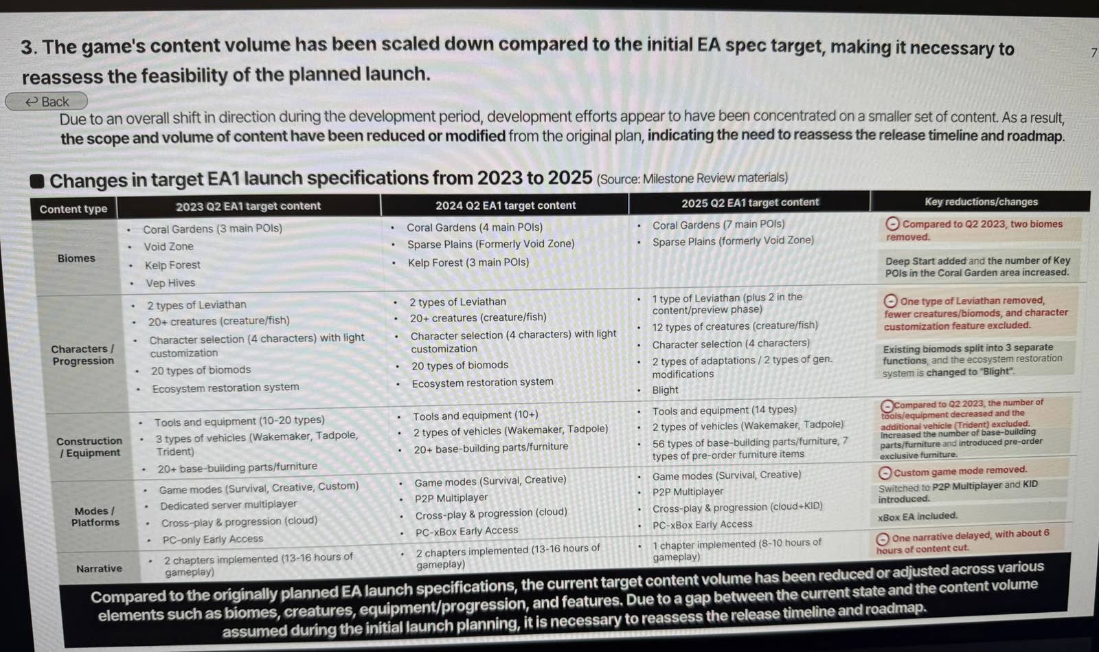Согласно одному источнику, объем задуманного контента для оригинального запуска EA был снижен или изменен в нескольких аспектах, таких как биомы, существа, развитие персонажа, оборудование и функции. Эта корректировка была сделана из-за несоответствия текущего состояния разработки с объемом контента, рассчитанным на начальной стадии планирования, что потребовало пересмотра графика выпуска.