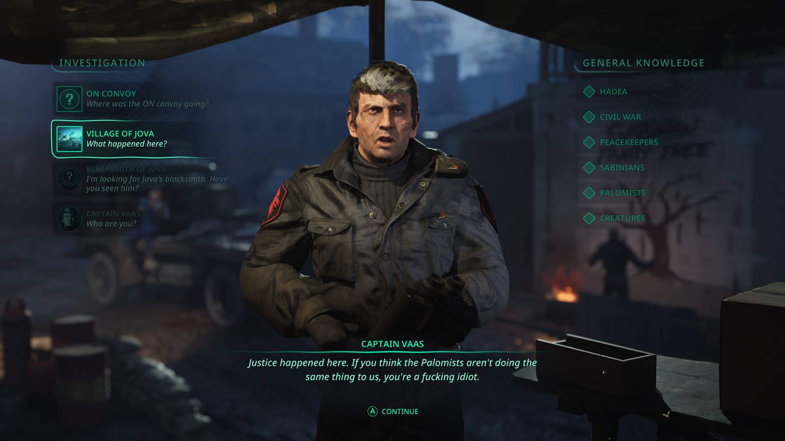 Я провел увлекательную беседу с капитаном сабинианцев, потрепанным и несколько преувеличенным персонажем, напоминающим неблагоприятные личности, с которыми можно столкнуться в игре под названием ‘Hell Is Us’. Он называет паломистов вредителями, которых необходимо уничтожить или интернировать, оправдывая свои действия тем, что паломисты совершили злодеяния, подобные и даже хуже их собственных. Справа от наблюдательного пункта капитана находится дом, где женщина рассказывает свою историю о том, как она подверглась сексуальному рабству в качестве наказания за участие в толпе паломистов (я осознал важность того, что дом был открыт, только когда ушел, учитывая, что двери обычно заперты в этой игре). Слева от входа отдыхают бездействующие члены расстрельной команды перед рядом недавно убитых гражданских лиц.